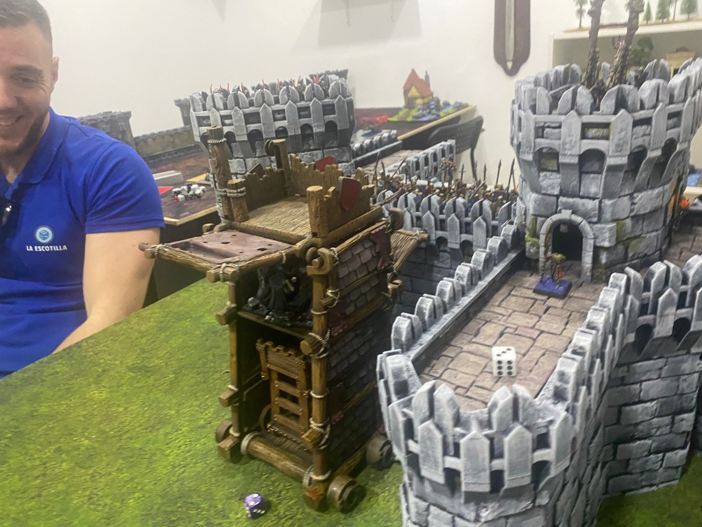 En el flanco izquierdo, la inmensa Torre de Asedio comenzó su inexorable viaje hacia las almenas. Los Ogros, bestias de puro músculo, empujaban la estructura de madera y hierro con una fuerza grotesca, sabiendo que en su interior portaban la llave de la masacre: los Guerreros de Khorne.