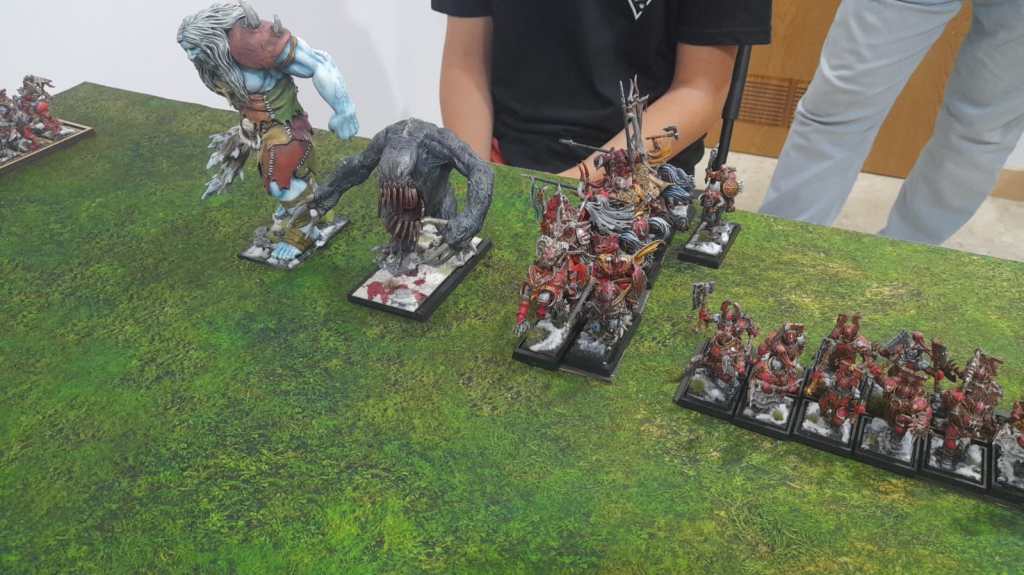 El choque fue titánico, una colisión absoluta entre dos fuerzas imparables: la disciplina gélida y silenciosa de la muerte contra la furia incandescente de la sangre. Los escudos ceremoniales de Khemri, forjados para durar eternamente, estallaron bajo el peso de las armas del Caos. Donde los esqueletos mantenían la línea con precisión autómata, los guerreros del norte respondían con una brutalidad salvaje, buscando no solo vencer, sino desmembrar.