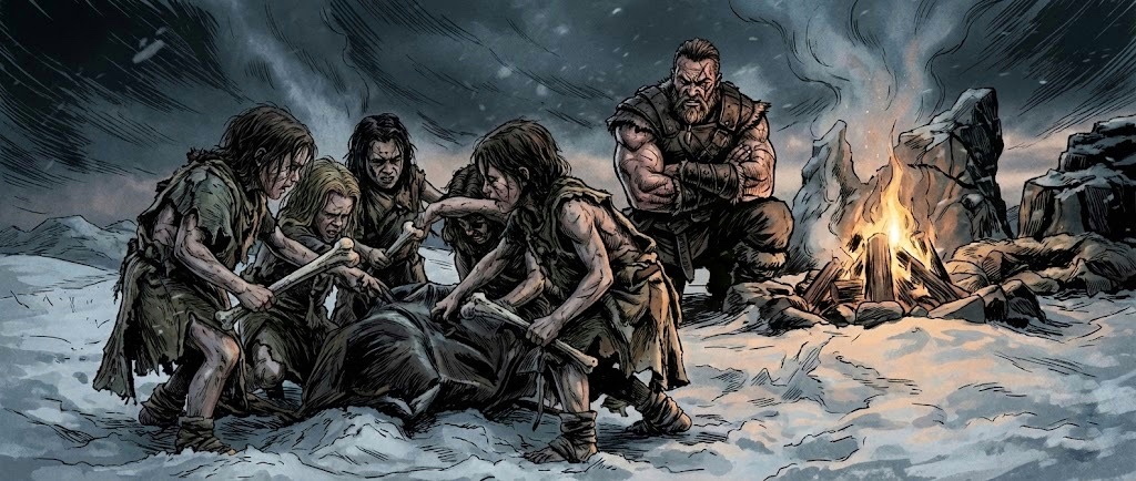 - El Descarte: Los Indignos son llevados a los picos y dejados en la «Roca de los Cachorros». Son la primera comida para las crías de los Fenrir. Solo los fuertes de cuerpo y sangre pura tienen derecho a comer. Los débiles, a ser comidos.