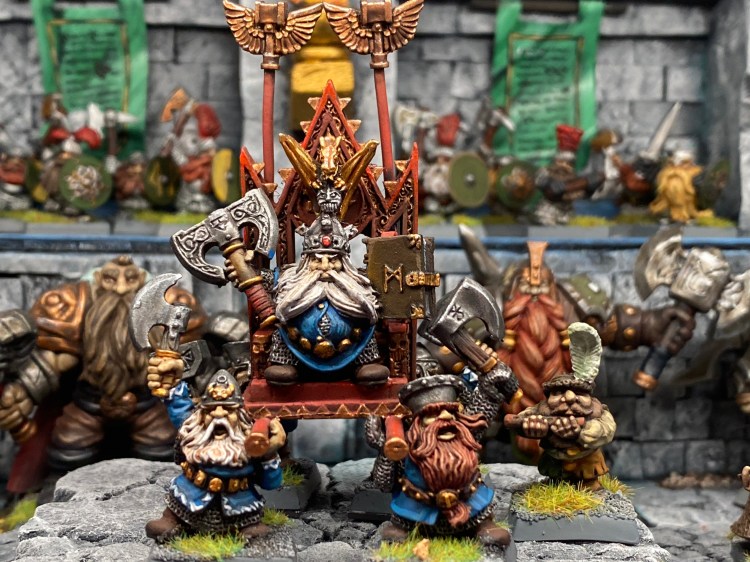 Vio una fortaleza imposible. Una montaña donde el tiempo no existía. En las profundidades, el legendario Brok Puñopétreo arrancaba ríos de oro infinito a la roca viva. En las forjas, Kragg el Gruñón no permitía que los yunques se enfriaran. En la cervecería, Josef Bugman destilaba su mejor reserva. En el Gran Salón, el Rey Thorgrim Custodio de Agravios sostenía consejo con leyendas vivas y muertas. Y en la cima, bajo un cielo de acero, los girocópteros y lanzavirotes cantaban desafiantes mientras el Rey Cazador soplaba el Cuerno de las Tormentas.
