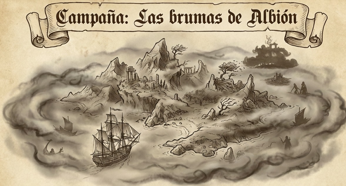 Les escribe Hendrik van der Maere, capitán de la Stille Wreker. En mi última travesía hacia Albión he hallado algo imposible: una de sus islas, siempre protegida por tormentas y brumas impenetrables, yace ahora rodeada por un mar en calma absoluta. Sus costas muestran montañas, dunas, ruinas vacías y una niebla que parece observar, pero también riquezas y recursos que harían salivar a cualquier príncipe mercader.