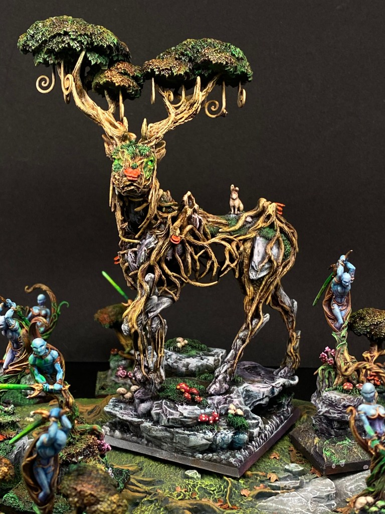 La tierra tembló. Con un crujido tectónico, como si el esqueleto de la isla se estuviera reordenando, las inmensas carcasas se pusieron en pie. Los Colosos de la Corteza se alzaron ante mí, revelándose como armaduras titánicas de roble ancestral, animadas desde dentro por el resplandor de mil almas feéricas. Sus núcleos brillan con vida prestada y sus puños de rama aguardan la orden para triturar la carne enferma de la hueste de Nurgle.