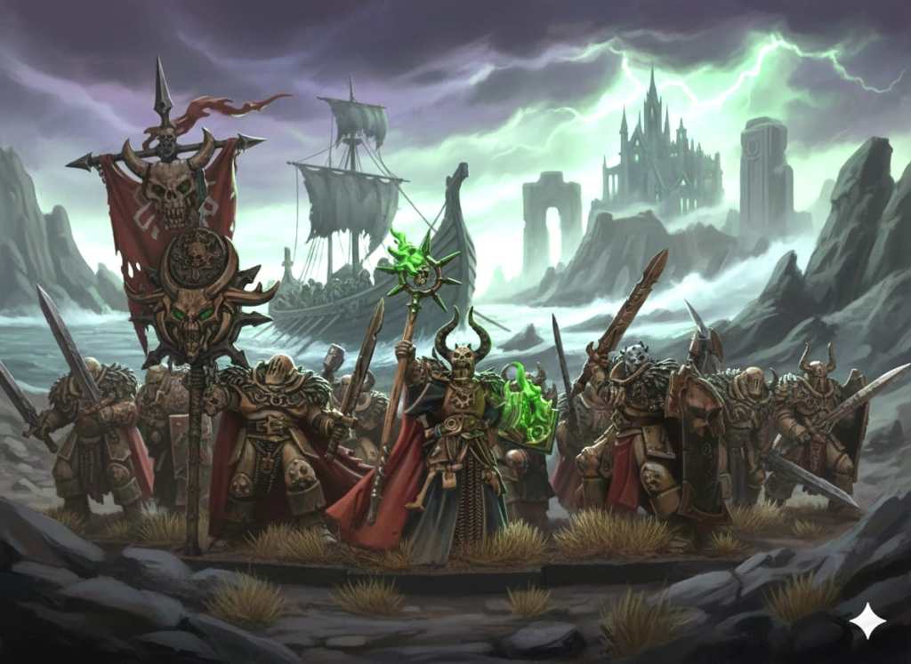 Sus ojos, que han visto nacer y morir imperios, proyectaron en mi mente la amenaza que repta por la costa: la Hueste Pálida del Magister Lysenko. Una marea de enfermedad y bárbaros marcados por la plaga que no buscan gloria, sino convertir la isla en un altar de podredumbre para «El que Devora la Luz».