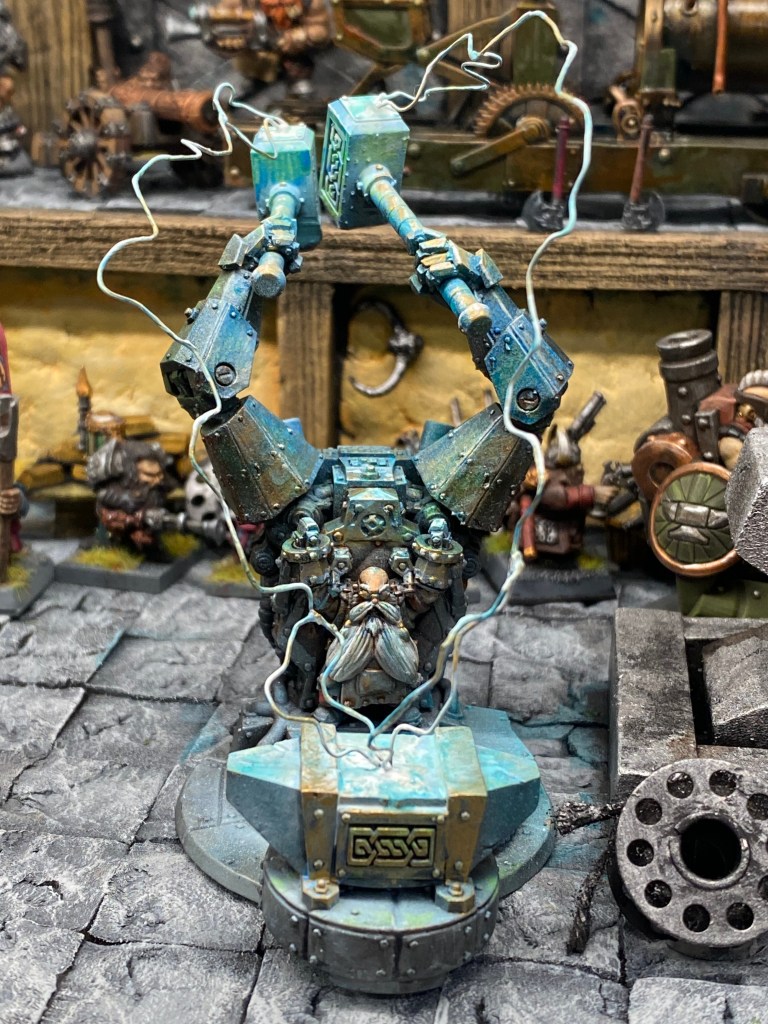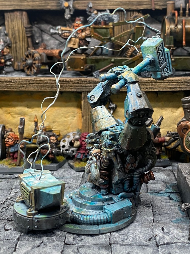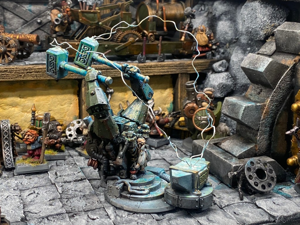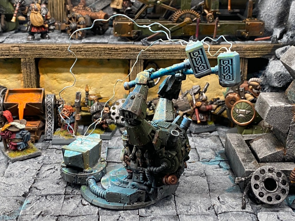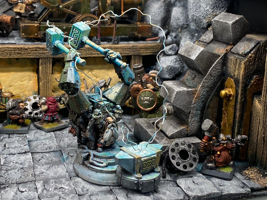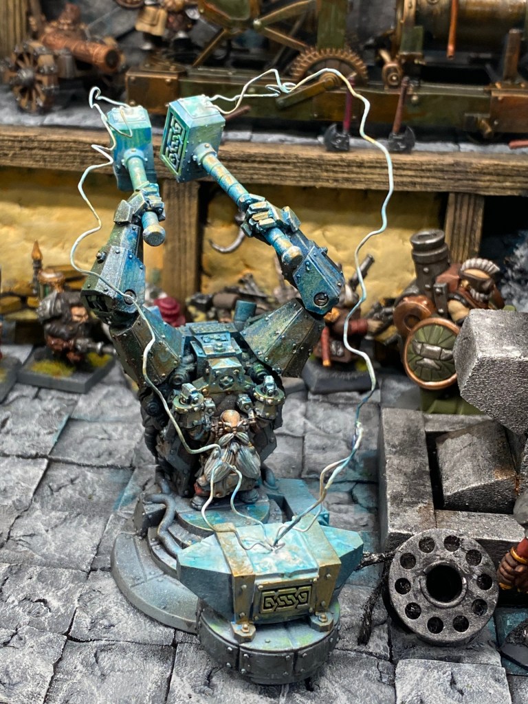 Allí está Thorek Cejohierro, el legendario Señor de las Runas de Karak Azul. Todos conocemos su famoso discurso: la tecnología debilita el espíritu, las Viejas Maneras son el único camino, volved a la tradición. Sin embargo, me froto los ojos ante lo que tengo delante. Thorek está frente a su yunque, encajado dentro de un colosal exoesqueleto de placas de gromril. Una gigantesca estructura de pistones, gruesos cables y engranajes levantan dos enormes martillos por él, potenciando su fuerza hasta niveles casi divinos.
