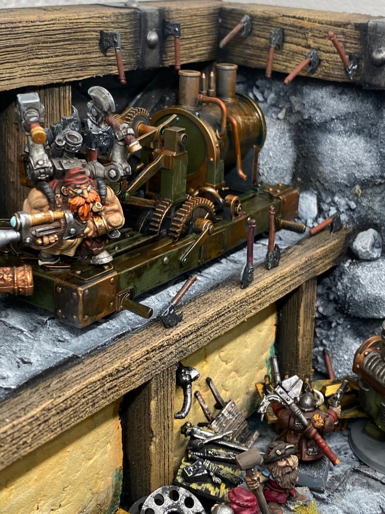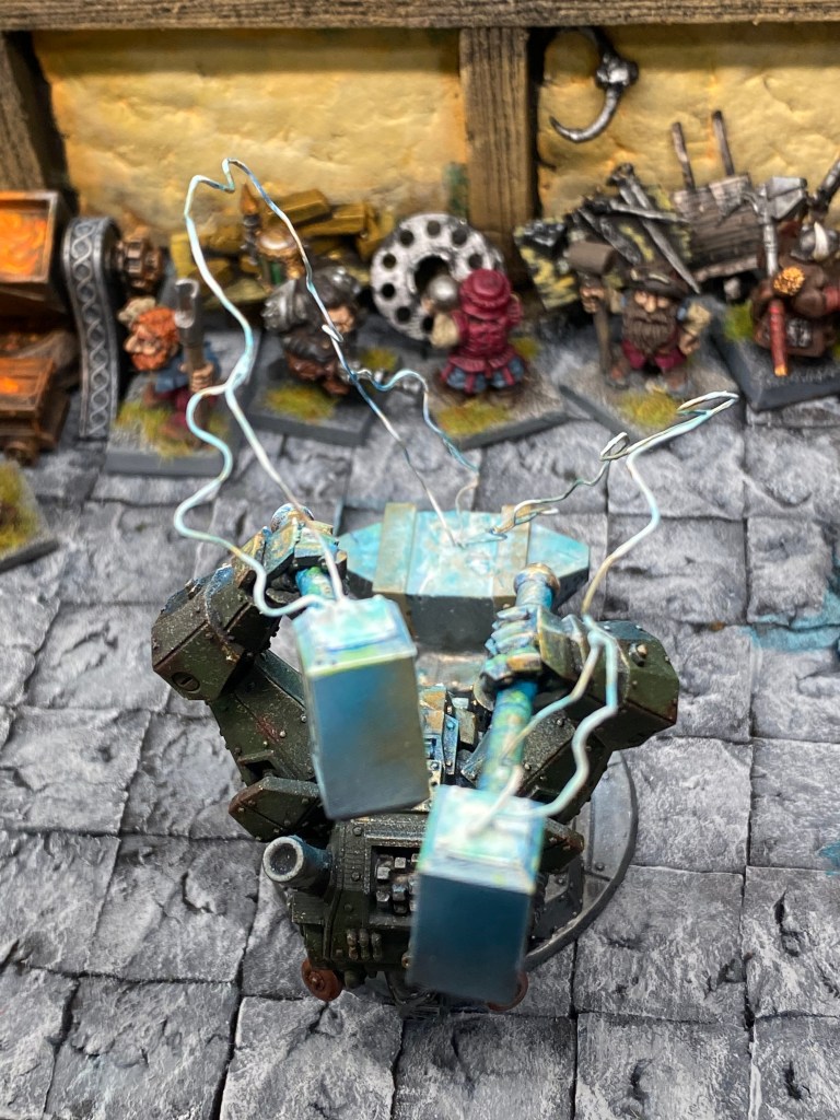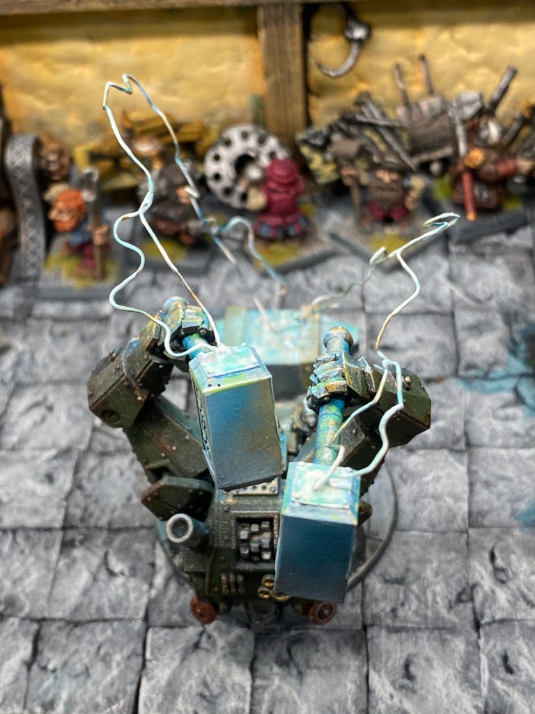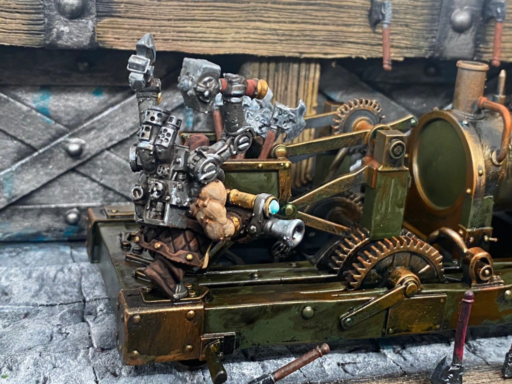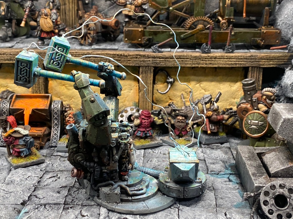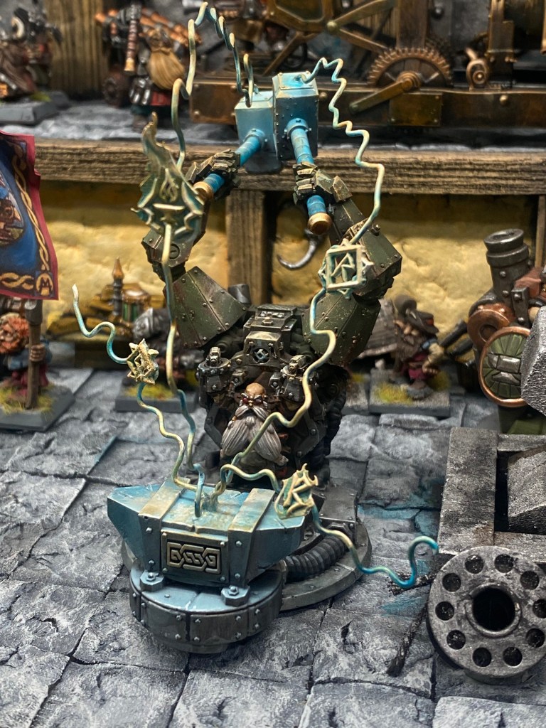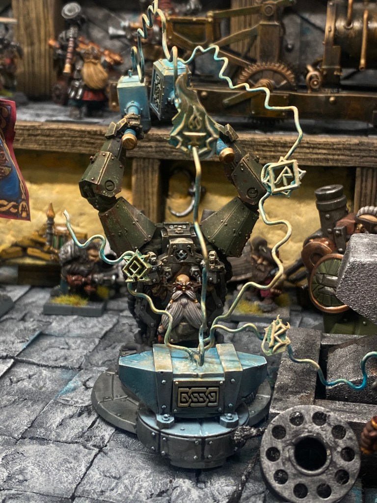 Allí está Thorek Cejohierro, el legendario Señor de las Runas de Karak Azul. Todos conocemos su famoso discurso: la tecnología debilita el espíritu, las Viejas Maneras son el único camino, volved a la tradición. Sin embargo, me froto los ojos ante lo que tengo delante. Thorek está frente a su yunque, encajado dentro de un colosal exoesqueleto de placas de gromril. Una gigantesca estructura de pistones, gruesos cables y engranajes levantan dos enormes martillos por él, potenciando su fuerza hasta niveles casi divinos.