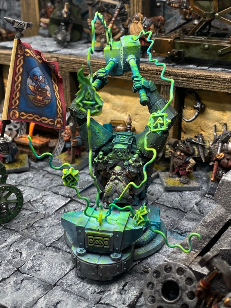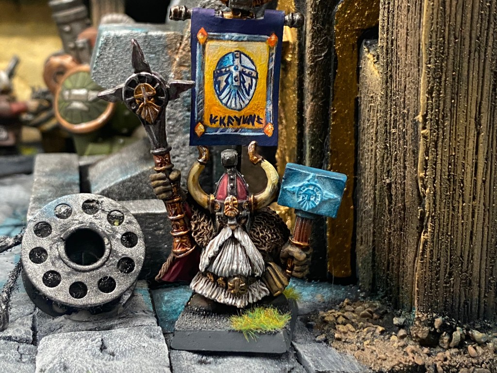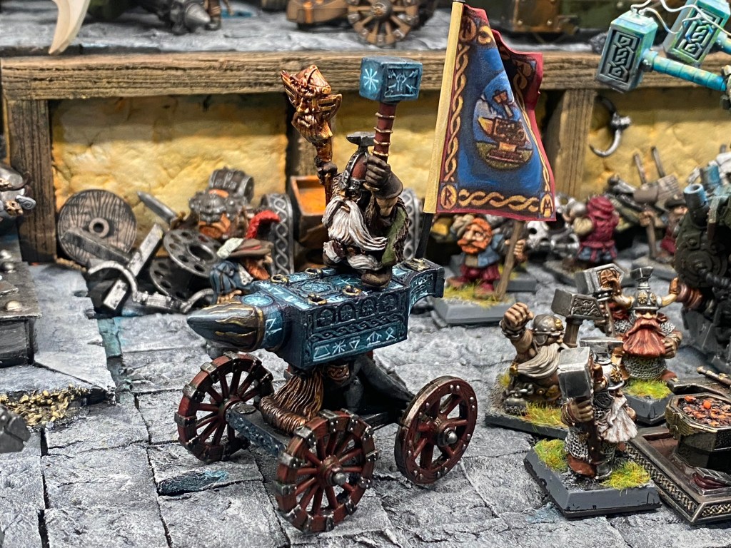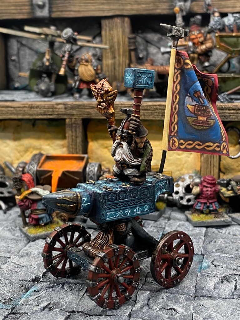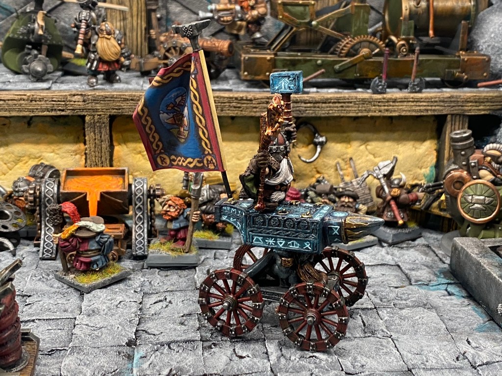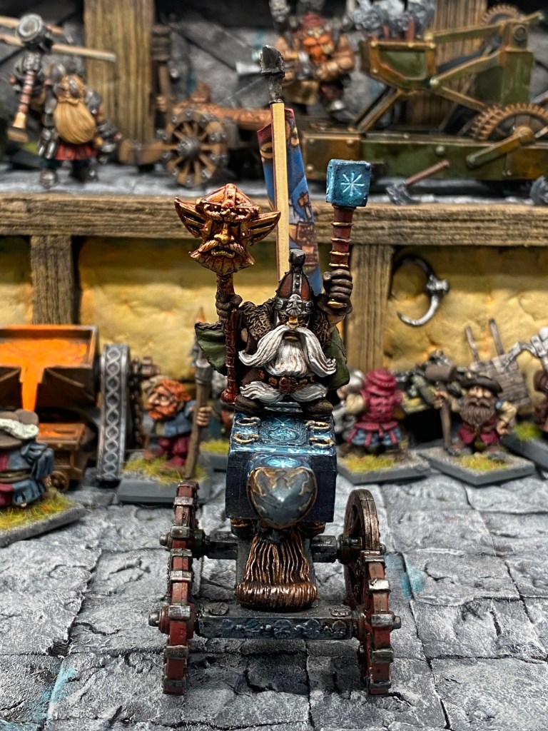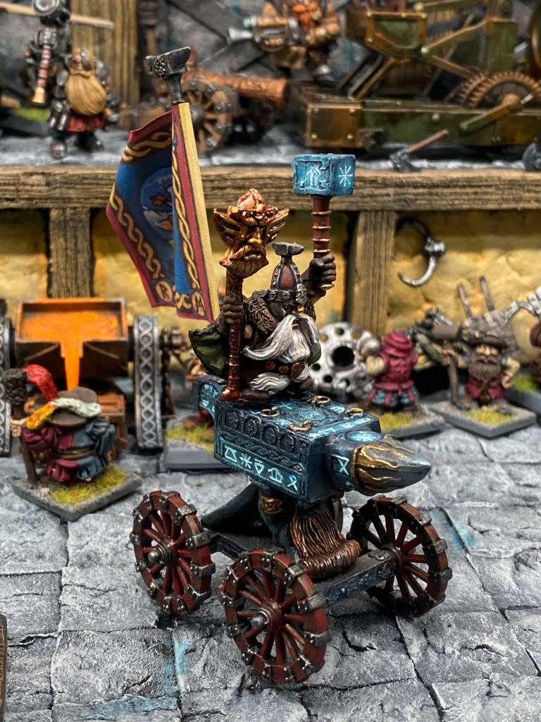 Allí, alzándose estoico bajo su estandarte, viaja el legendario Kurgaz, el forjador primigenio y padre de los Yunques de la Perdición. Sin embargo, su reliquia no está anclada a las profundidades de la roca madre. En un acto de audacia táctica sin precedentes, Kurgaz ha montado la magia más pesada y sagrada de nuestra raza sobre un recio chasis móvil. Mientras empuña su martillo con una fiereza que desafía a sus años, la intención queda clara: si la furia de los Ancestros hace falta en el frente de batalla, este viejo maestro no va a esperar sentado. Él llevará la forja a la guerra.