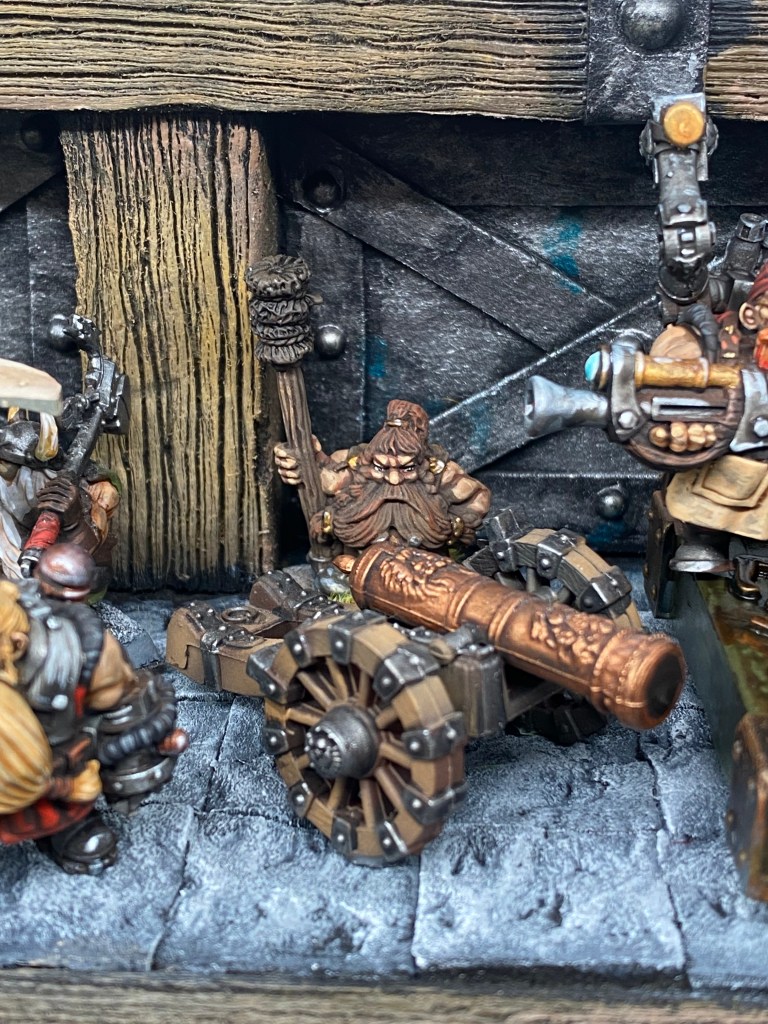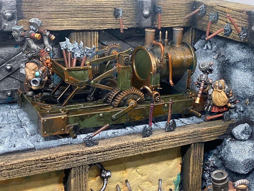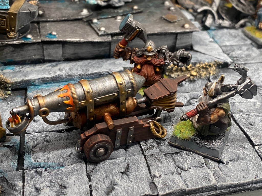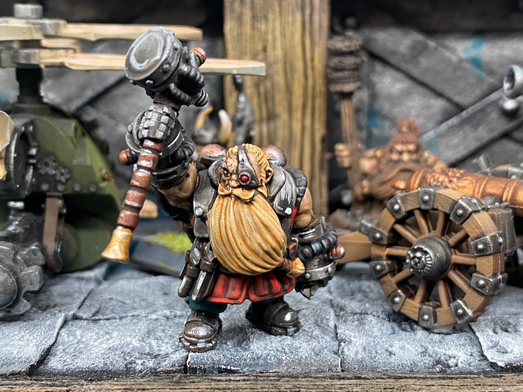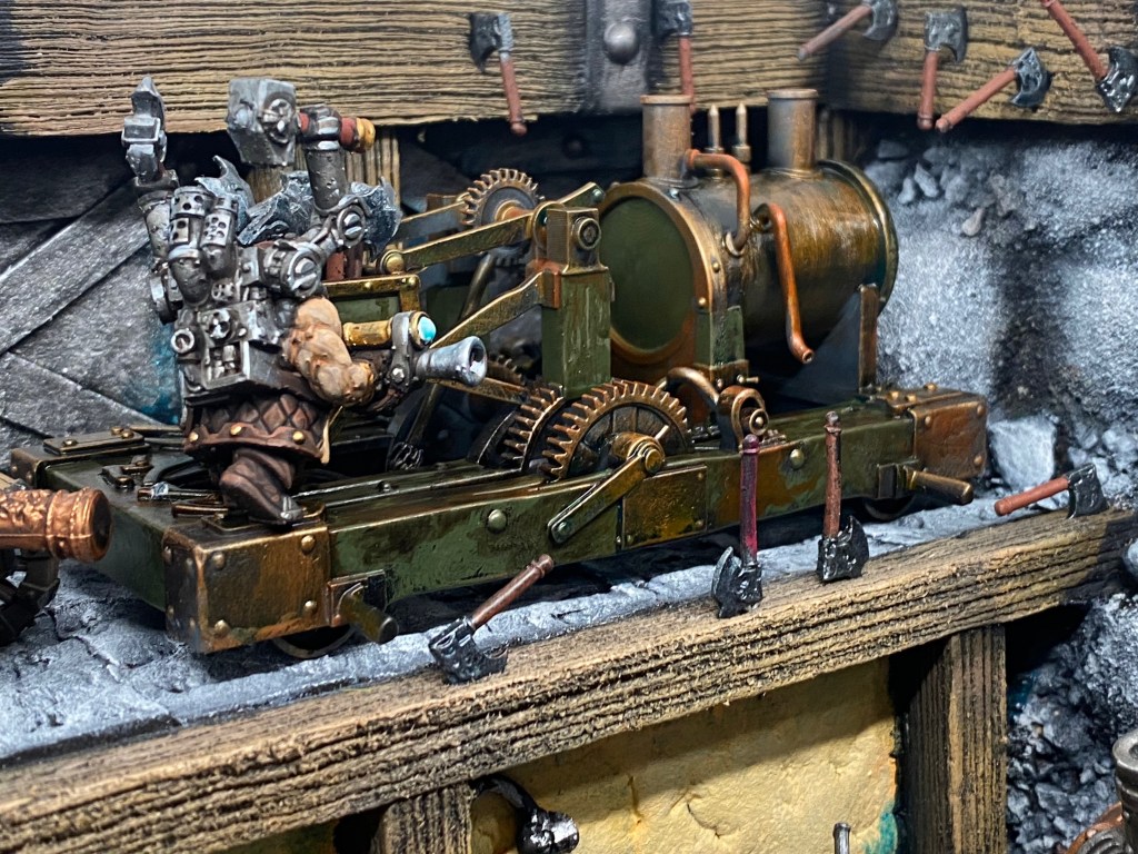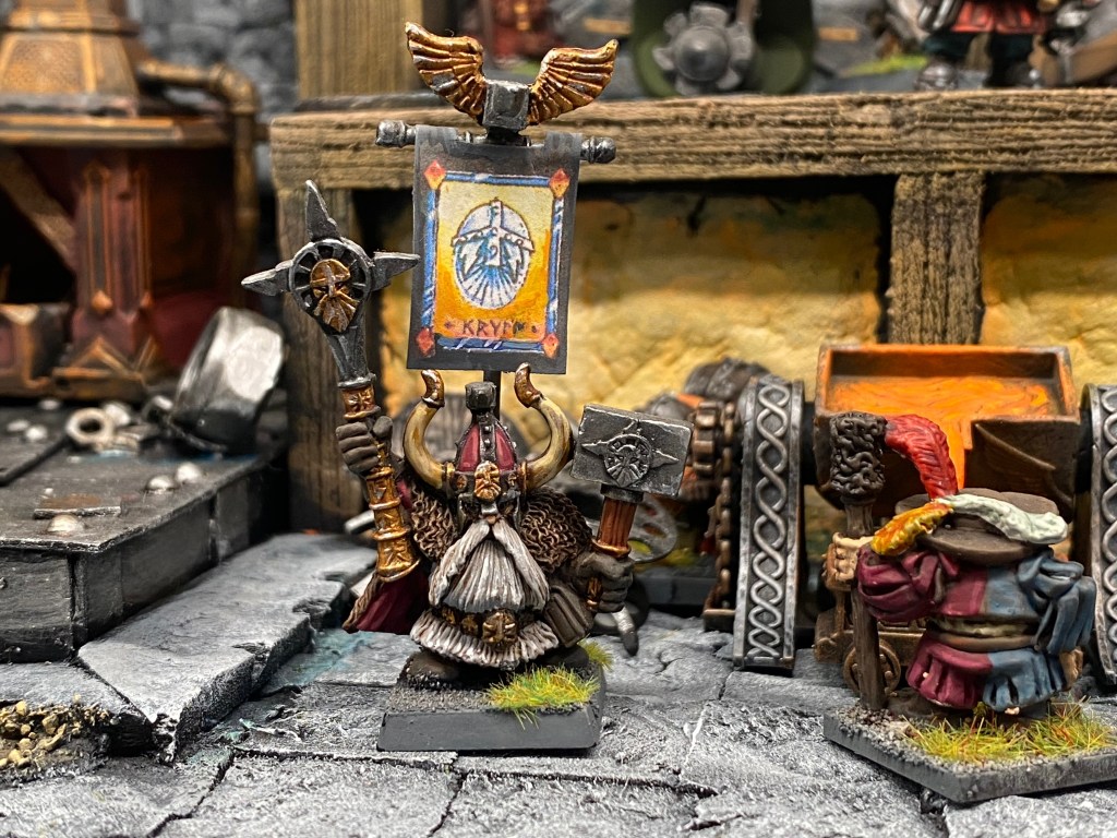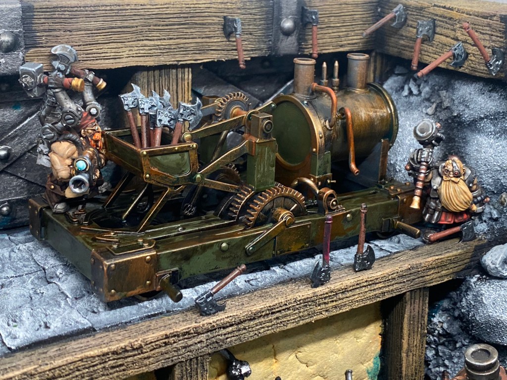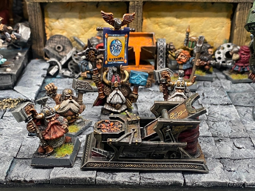 Allí, alzándose estoico bajo su estandarte, viaja el legendario Kurgaz, el forjador primigenio y padre de los Yunques de la Perdición. Sin embargo, su reliquia no está anclada a las profundidades de la roca madre. En un acto de audacia táctica sin precedentes, Kurgaz ha montado la magia más pesada y sagrada de nuestra raza sobre un recio chasis móvil. Mientras empuña su martillo con una fiereza que desafía a sus años, la intención queda clara: si la furia de los Ancestros hace falta en el frente de batalla, este viejo maestro no va a esperar sentado. Él llevará la forja a la guerra.
