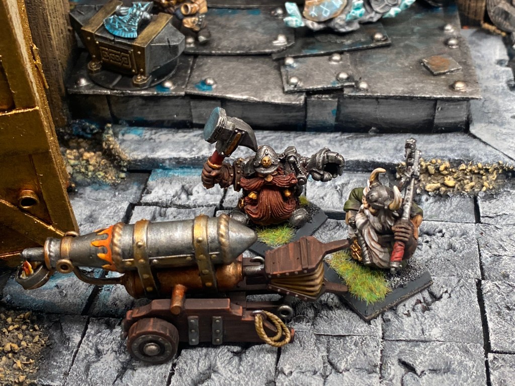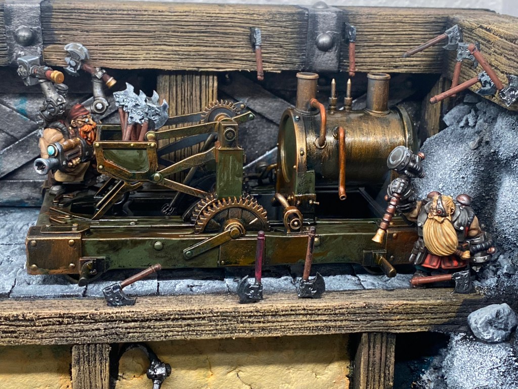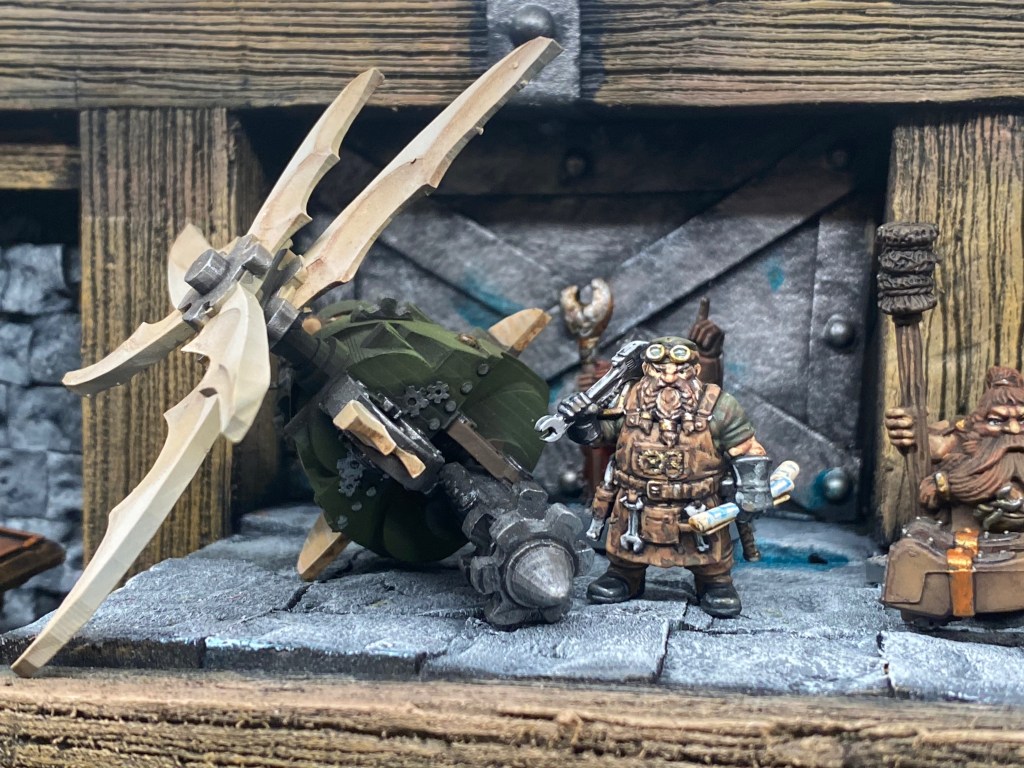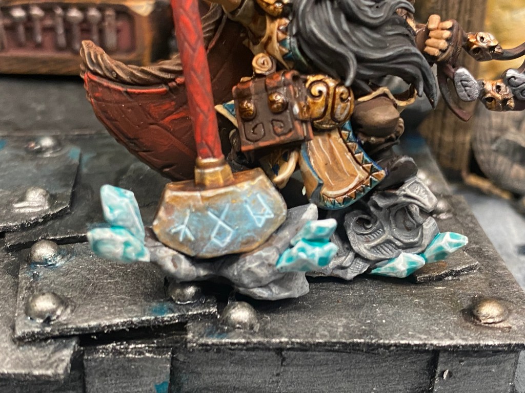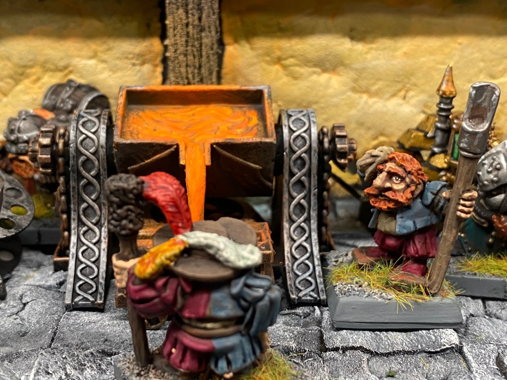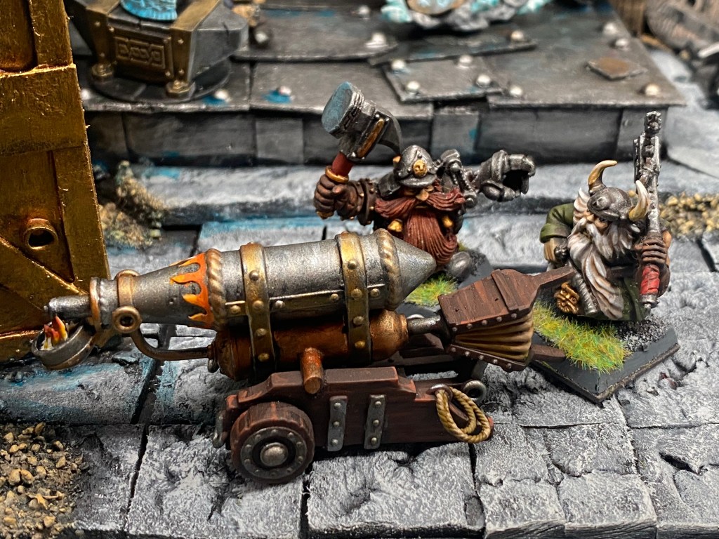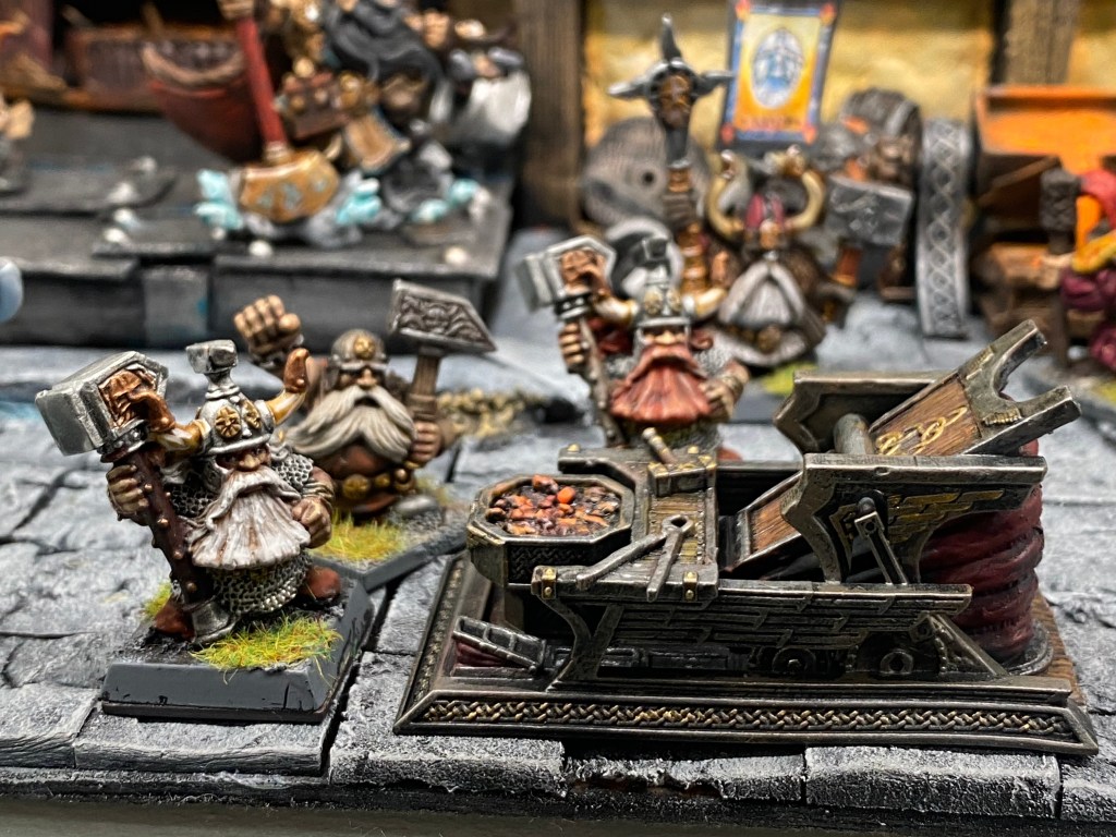 Allí, alzándose estoico bajo su estandarte, viaja el legendario Kurgaz, el forjador primigenio y padre de los Yunques de la Perdición. Sin embargo, su reliquia no está anclada a las profundidades de la roca madre. En un acto de audacia táctica sin precedentes, Kurgaz ha montado la magia más pesada y sagrada de nuestra raza sobre un recio chasis móvil. Mientras empuña su martillo con una fiereza que desafía a sus años, la intención queda clara: si la furia de los Ancestros hace falta en el frente de batalla, este viejo maestro no va a esperar sentado. Él llevará la forja a la guerra.