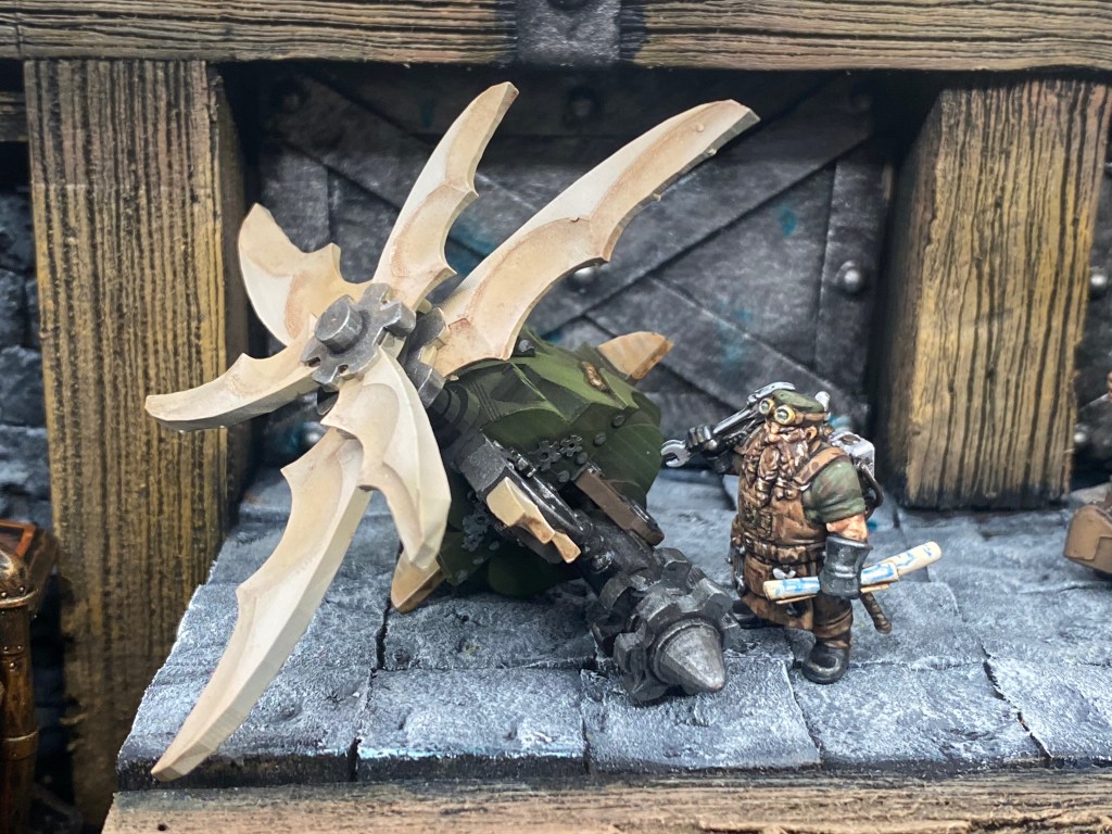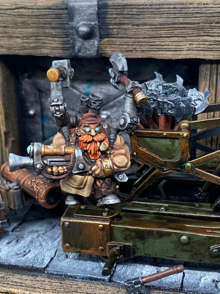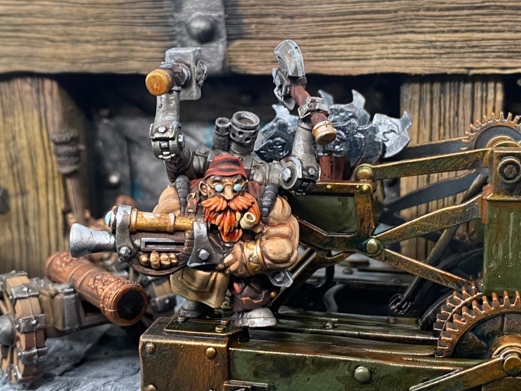 La pesada máquina de artillería ruge bajo sus botas. Sus correas y engranajes giran a una velocidad que desafía cualquier margen de seguridad enano. Es una tormenta latente de cuchillas y vapor a punto de estallar. A diferencia de sus recelosos colegas, que construyen para que sus obras duren eternamente, Malakai construye para destruir gloriosamente, buscando en cada mecanismo al límite y en cada hoja afilada su propia y ensangrentada redención.