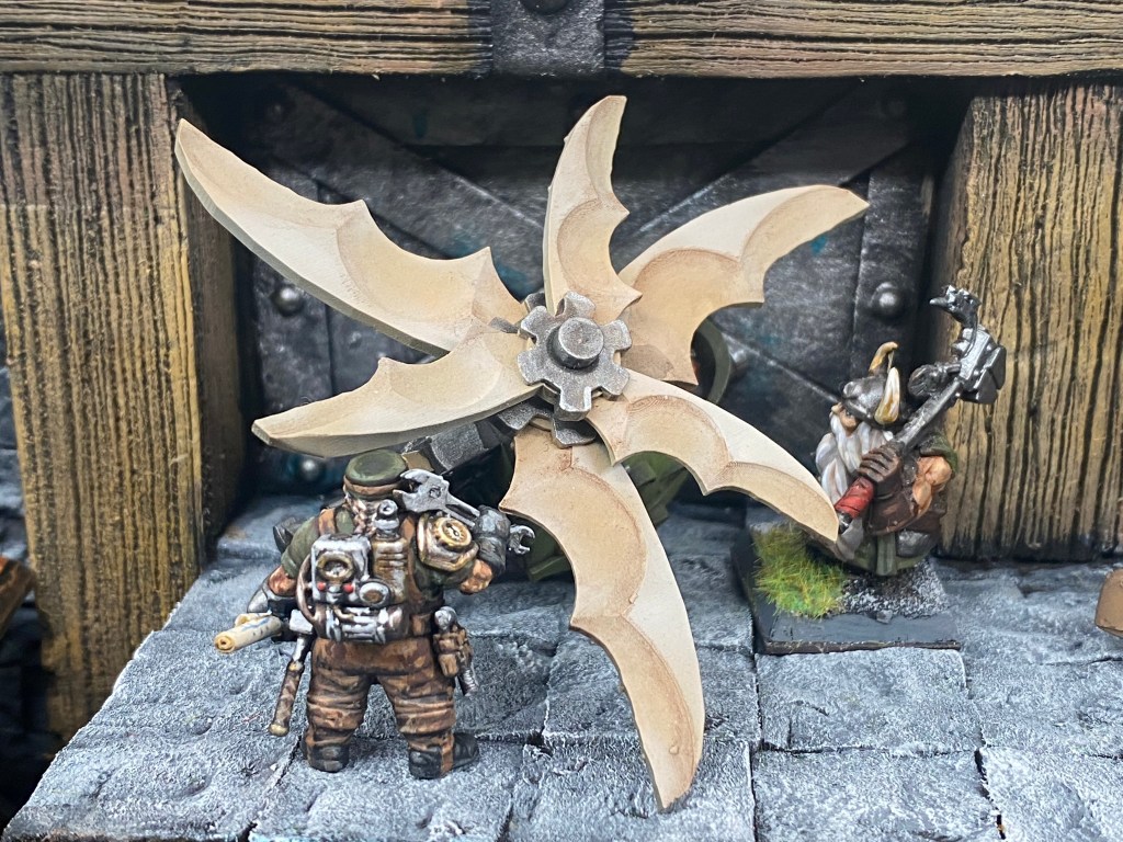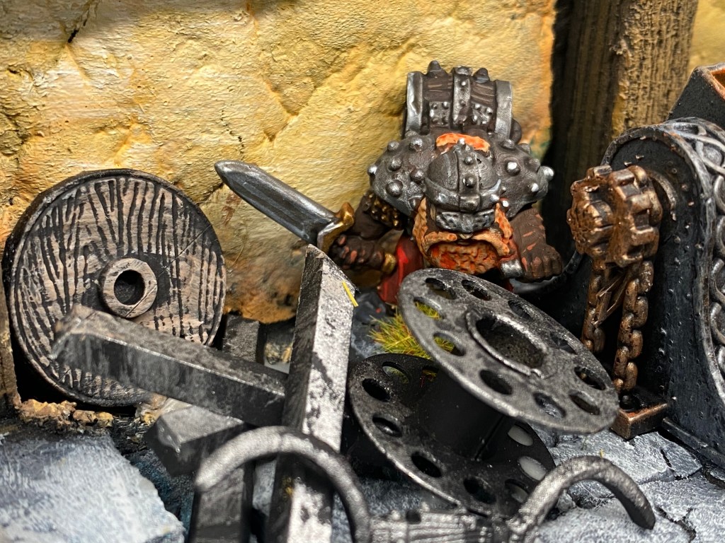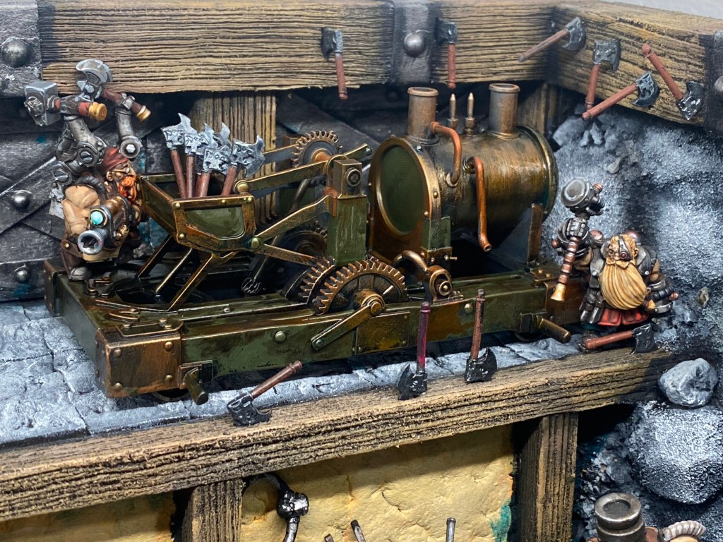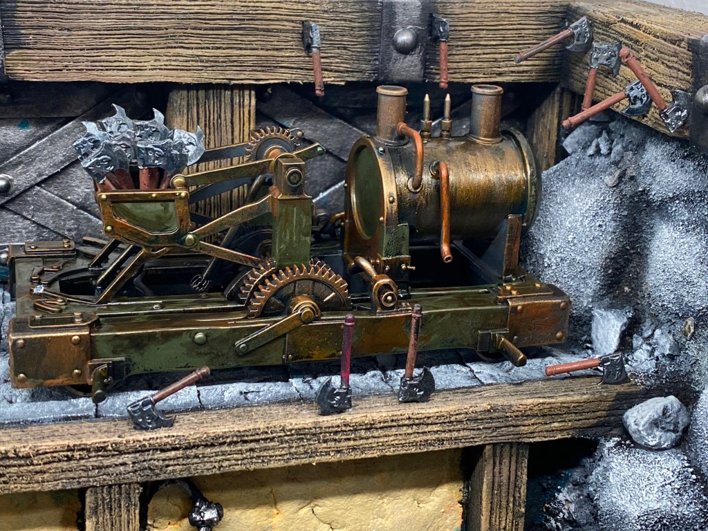 A su alrededor, las robustas vigas de madera de la forja están acribilladas por docenas de hachas profundamente clavadas. Es la zona de pruebas de su mayor monstruosidad: el Cercenagoblins.