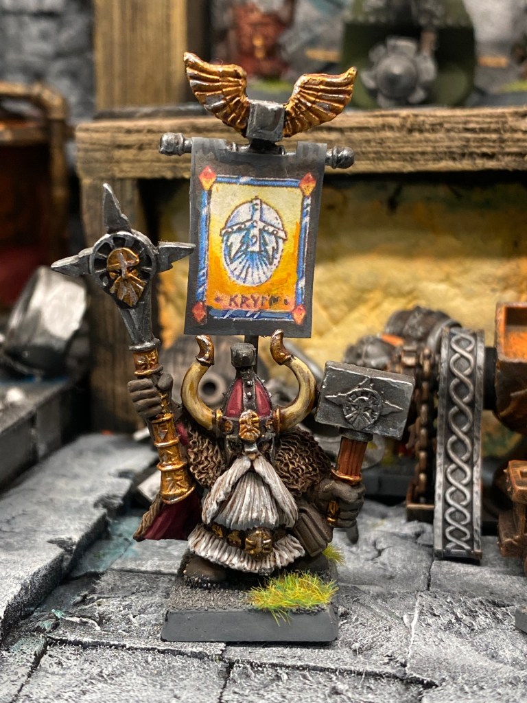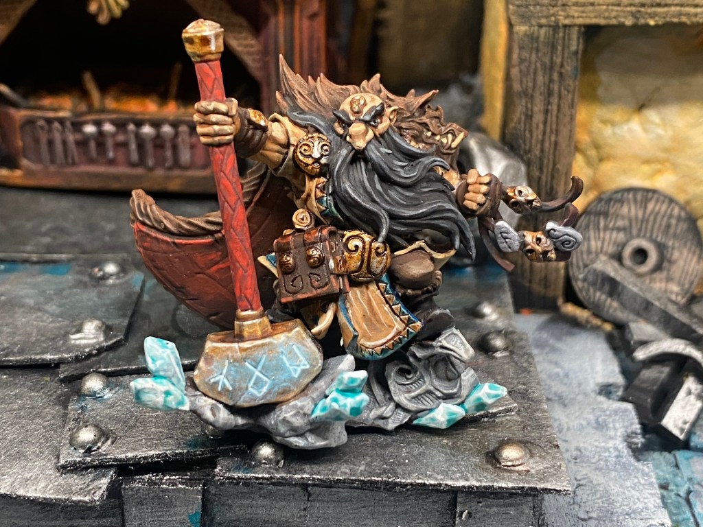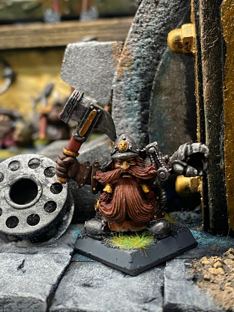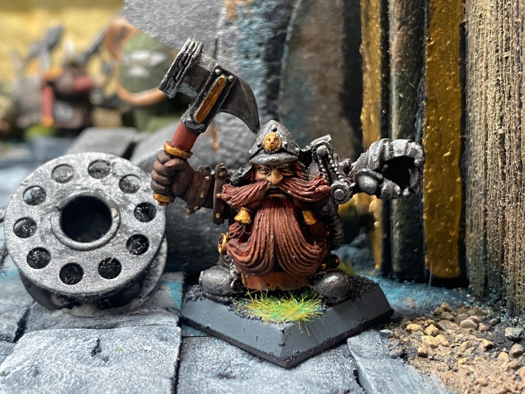 Su presencia es imponente; una barba trenzada que casi toca el suelo, una armadura ornamentada y ese brazo mecánico de Gromril y latón, un prodigio de la ingeniería que se mueve con una precisión aterradora, muy superior a cualquier brazo natural. Impone respeto y un poco de miedo; su sola mirada crítica detiene el corazón de cualquier aprendiz. Él es la autoridad indiscutible, el hombre que ha transformado la «locura» de la innovación desmedida en una ciencia sagrada y respetable.