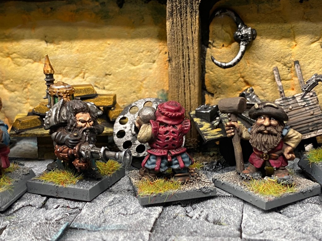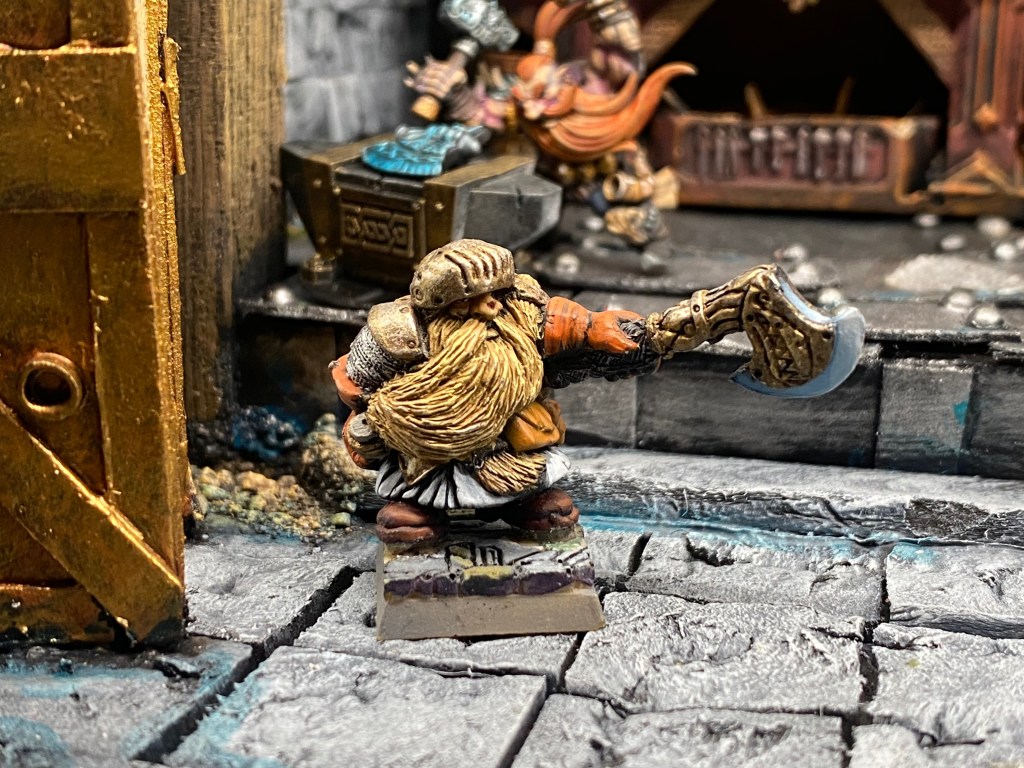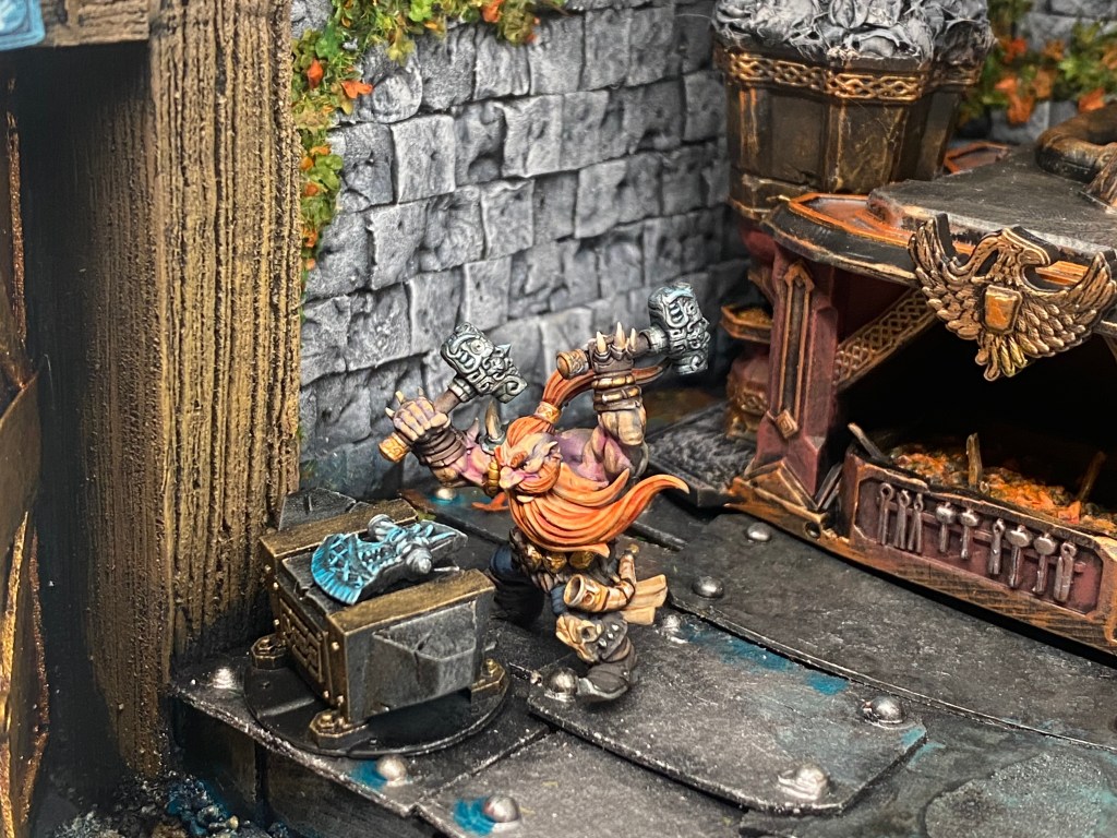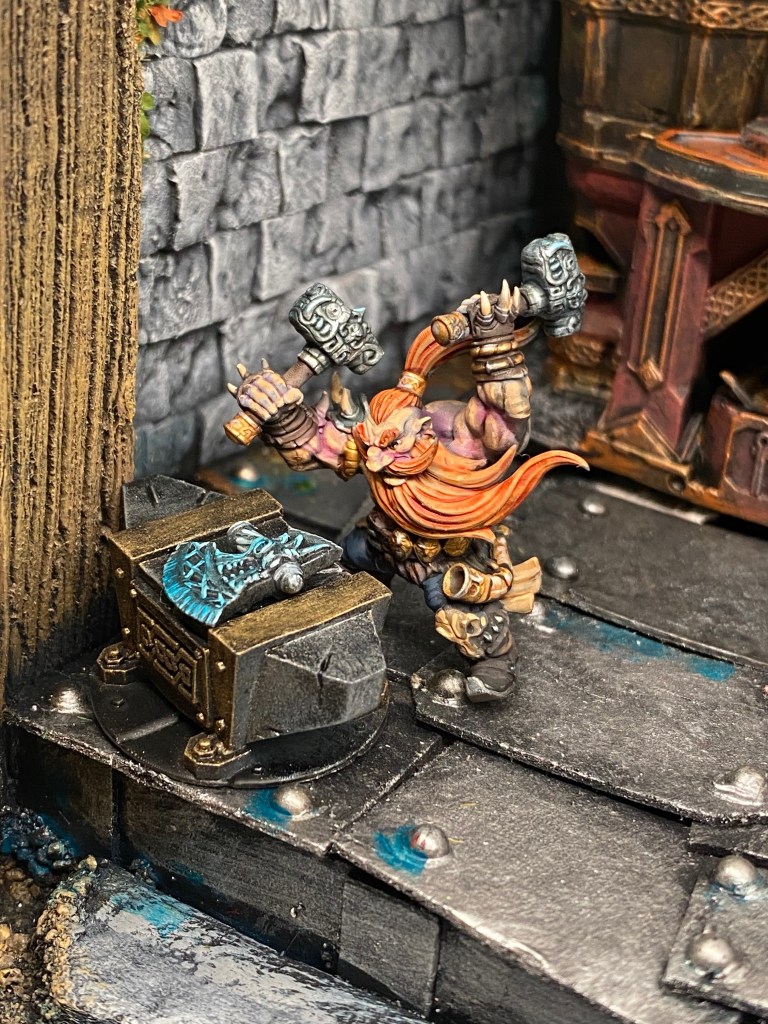 Su presencia es imponente; una barba trenzada que casi toca el suelo, una armadura ornamentada y ese brazo mecánico de Gromril y latón, un prodigio de la ingeniería que se mueve con una precisión aterradora, muy superior a cualquier brazo natural. Impone respeto y un poco de miedo; su sola mirada crítica detiene el corazón de cualquier aprendiz. Él es la autoridad indiscutible, el hombre que ha transformado la «locura» de la innovación desmedida en una ciencia sagrada y respetable.