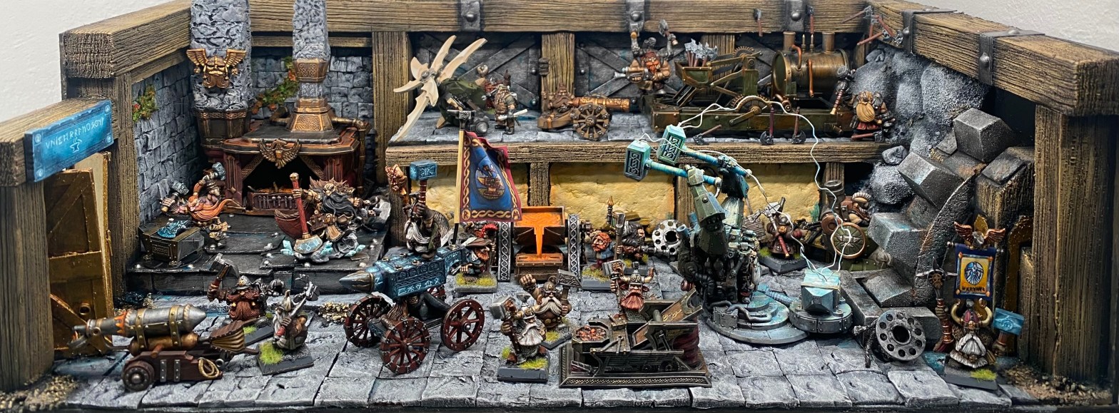 Allí, alzándose estoico bajo su estandarte, viaja el legendario Kurgaz, el forjador primigenio y padre de los Yunques de la Perdición. Sin embargo, su reliquia no está anclada a las profundidades de la roca madre. En un acto de audacia táctica sin precedentes, Kurgaz ha montado la magia más pesada y sagrada de nuestra raza sobre un recio chasis móvil. Mientras empuña su martillo con una fiereza que desafía a sus años, la intención queda clara: si la furia de los Ancestros hace falta en el frente de batalla, este viejo maestro no va a esperar sentado. Él llevará la forja a la guerra.