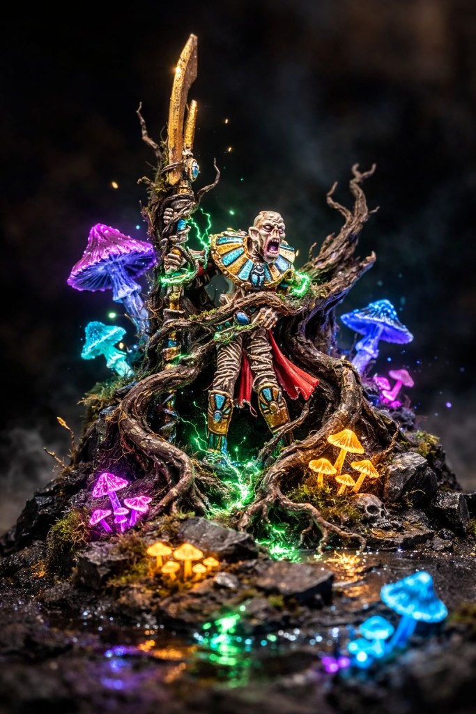 Simultáneamente, guiada por Jalynrix a través de recovecos en el techo, nuestra verdadera fuerza de choque irrumpió directamente en la retaguardia de Khemri. La Guardia del Micelio emergió del polvo en un silencio sepulcral, deslizándose con sus letales báculos listos para la embestida.