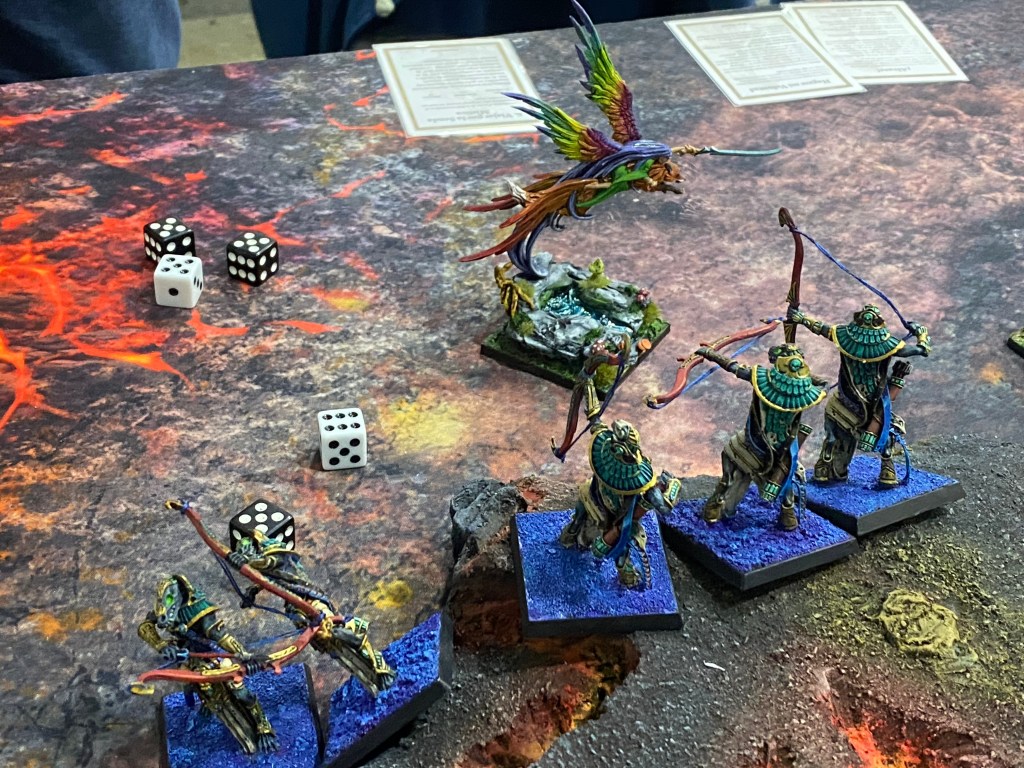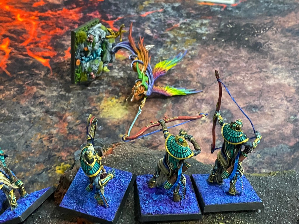 Ese ahogo mágico nos costó muy caro. Desprovistos de la cobertura del fuego, nuestras fuerzas flanqueadoras quedaron expuestas a la disciplina eterna de Bhagar. Los Ushabtis arqueros giraron sobre sus talones con un movimiento mecánico y aterrador. No importó la velocidad de vuelo ni nuestra agilidad; las flechas de Asaph fueron guiadas por un designio divino. La lluvia de hueso alcanzó a Syra en pleno vuelo, derribando a la majestuosa Vigía del Bosque, cuyo cuerpo se estrelló contra la piedra incandescente.
