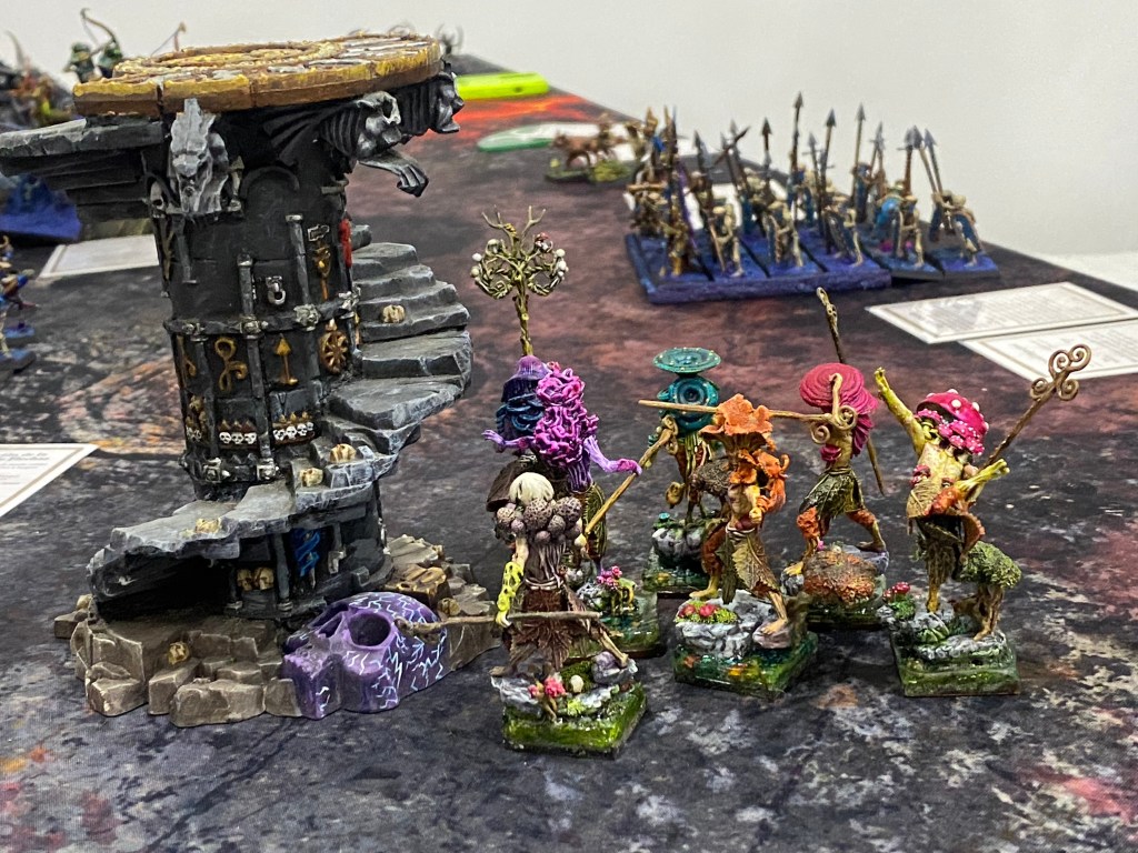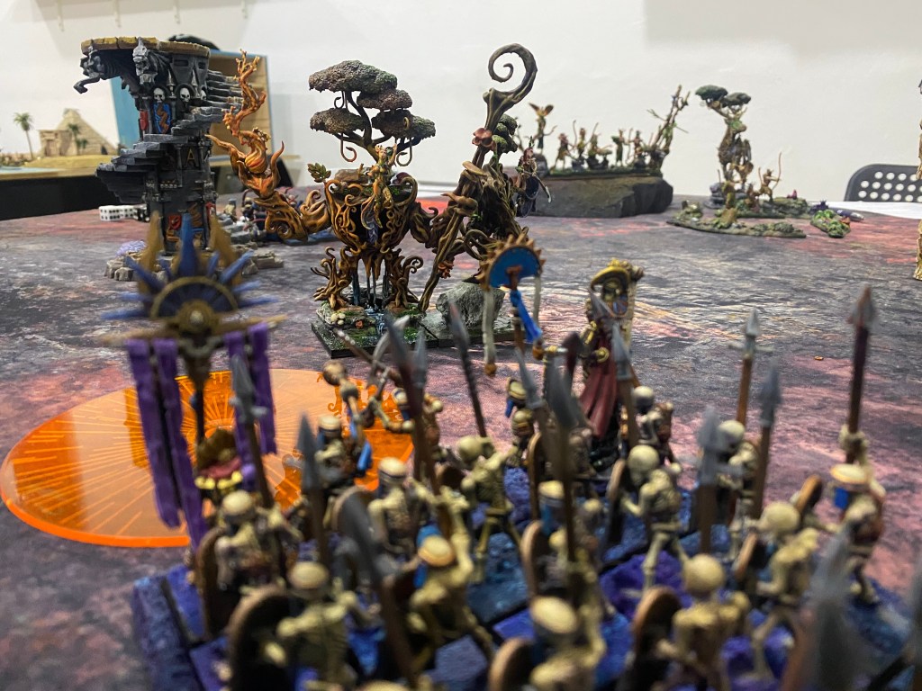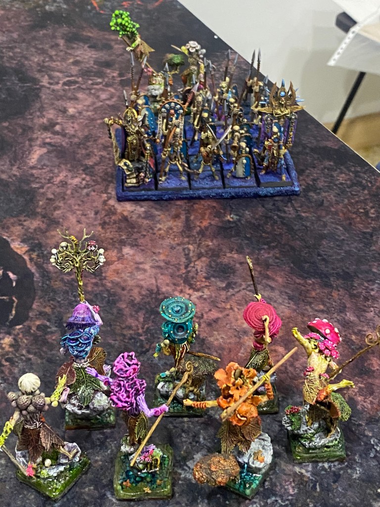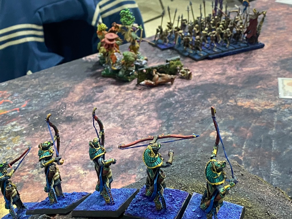 Repelidos tras la carga, una segunda ráfaga de los implacables Ushabtis cayó sobre ellos. Los monjes fúngicos, letales en el cuerpo a cuerpo pero frágiles ante el fuego concentrado, fueron diezmados brutalmente. Sus cuerpos vegetales caían inertes.