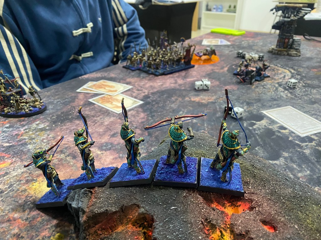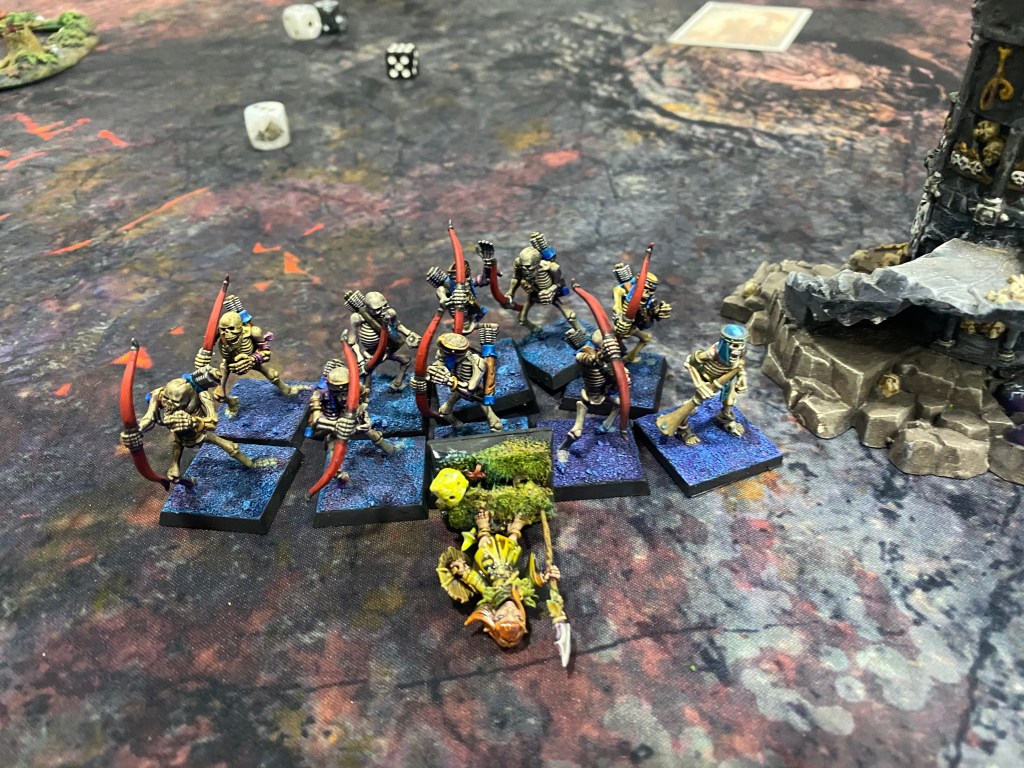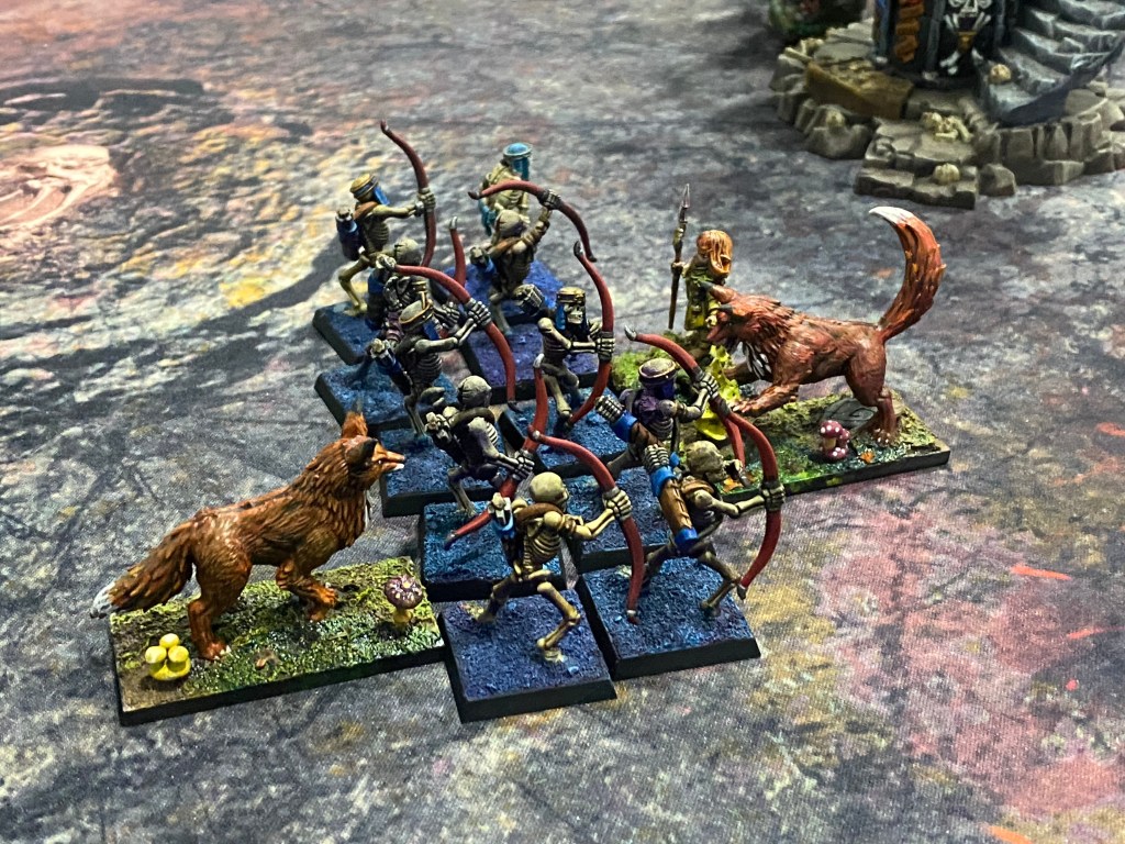 Frente a nosotros, la disciplina de la muerte. En el centro, veinte arqueros esqueleto escoltaban al sacerdote de Bhagar (hierofante en ausencia de su general). A su izquierda, una imponente escolta de 5 Ushabtis armados con grandes arcos; a su derecha, 3 Ushabtis armados con Filos Rituales y un Gólem Escorpión acechando bajo la roca. Por si fuera poco, los ladrones de tumbas habían infiltrado a sus Perros del Desierto sobre camellos pulgosos a nuestras espaldas.