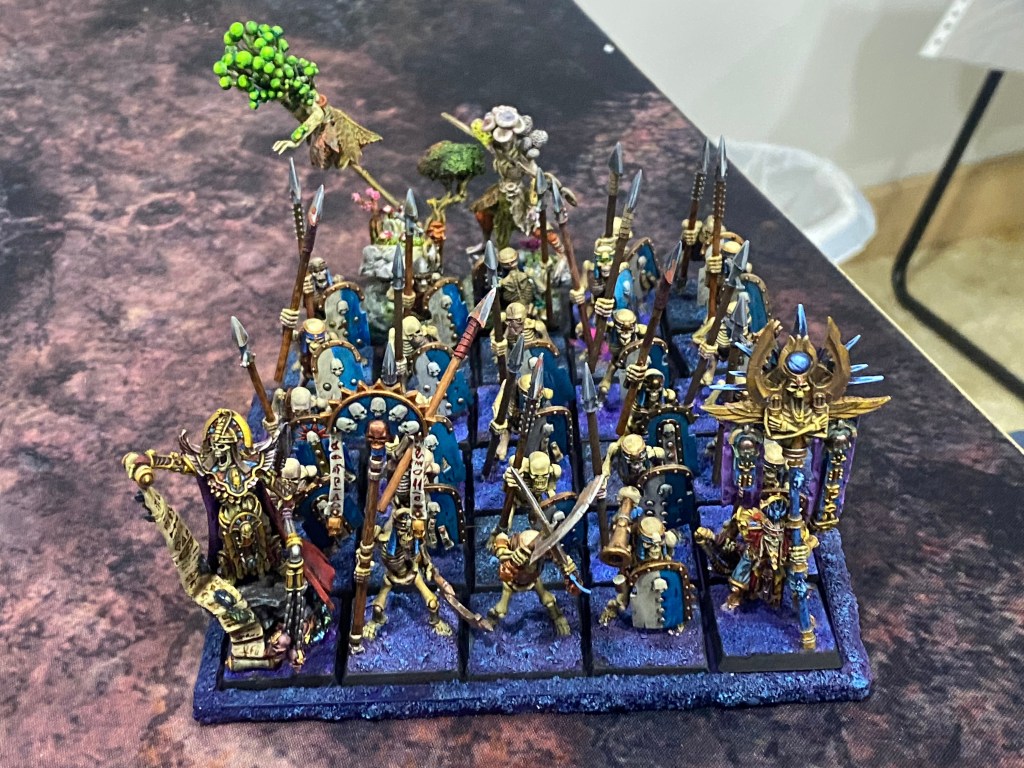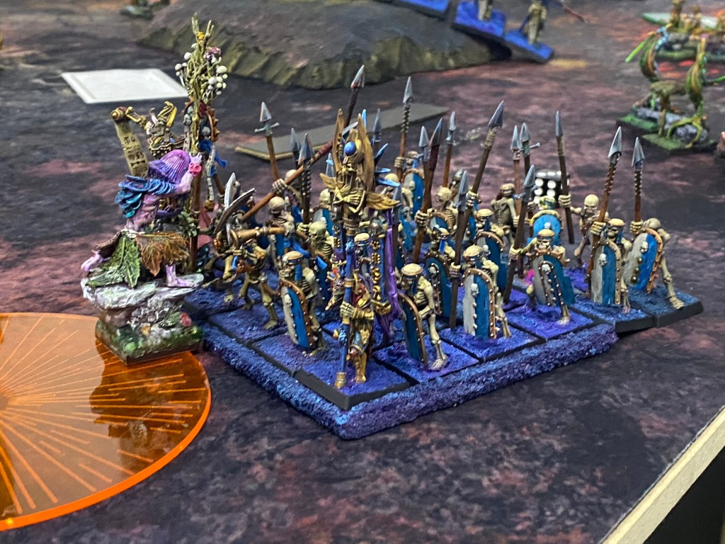 251 – 26 Guerreros Esqueleto, armadura ligera, Falange Nehekariana, lanza, escudo, Maestro de Armas (Máscara de Muerte), Musico, Icono de los Ojos Sagrados