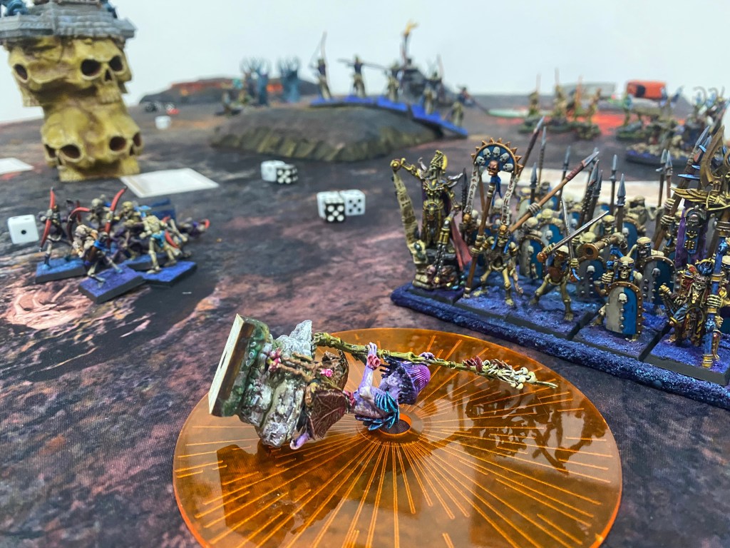 Observando la carnicería táctica, y con mis sentidos mágicos asfixiados por la luz mortecina del Arca, lancé una última y desesperada orden. Mis Colosos de la Corteza, tras arrasar a los arqueros esqueletos, embistieron con toda la furia restante contra la unidad del Gran Sacerdote Funerario. Lograron identificar al general y asestarle dos demoledores golpes arbóreos que habrían partido por la mitad a un dragón. Sin embargo, un golpe fue esquivado milagrosamente, y el otro fue absorbido por los talismanes del Gran Sacerdote de Bhagar, brillando con una luz dorada y blasfema. La última esperanza de Albión se deshizo ante la protección divina de sus reyes muertos.