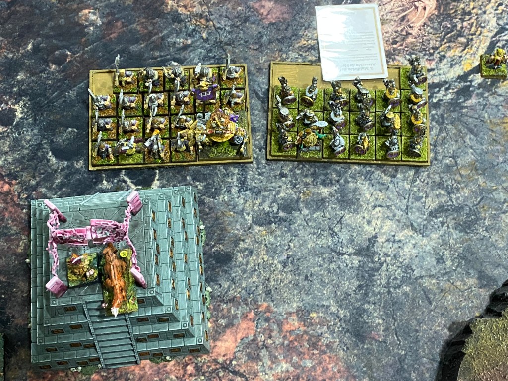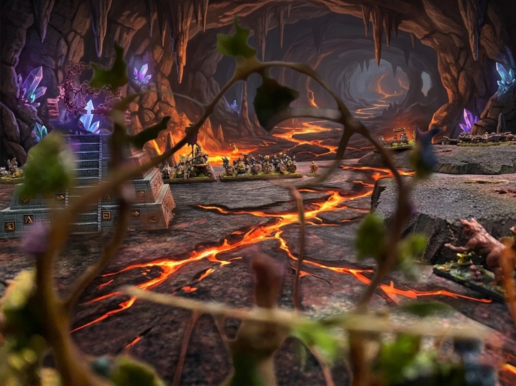 En el corazón de la caverna, la línea enana era un muro infranqueable. La unidad de Rompehierros, liderada por el Herrero Rúnico Grimnar y Ojo de Hierro Kargun, con arcabuz rúnico, absorbió una cantidad de castigo inimaginable.