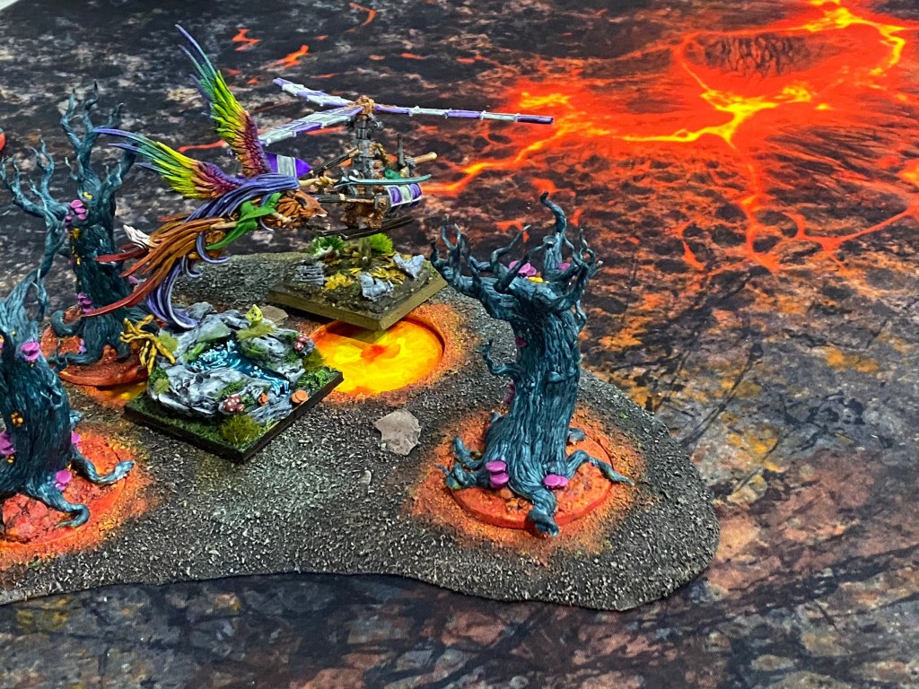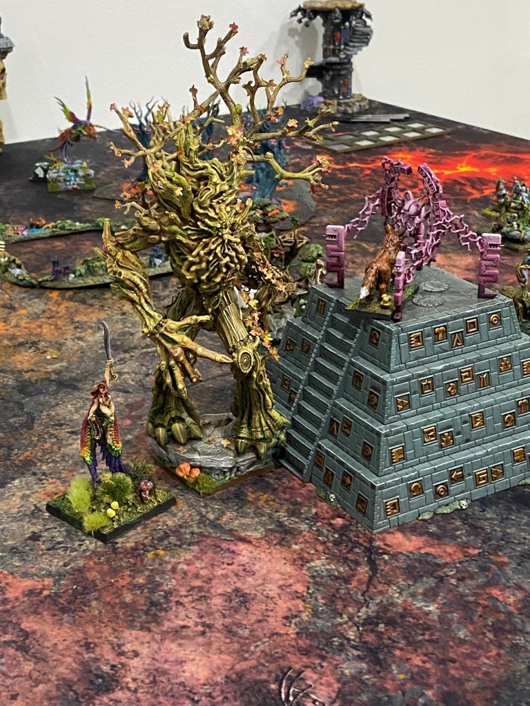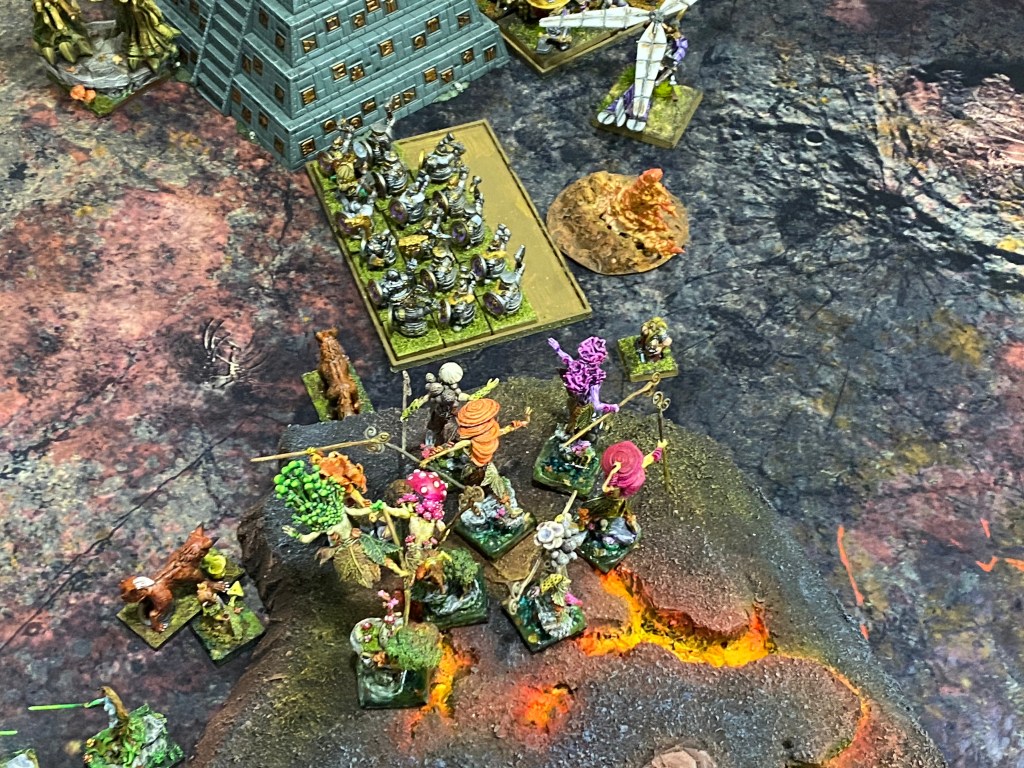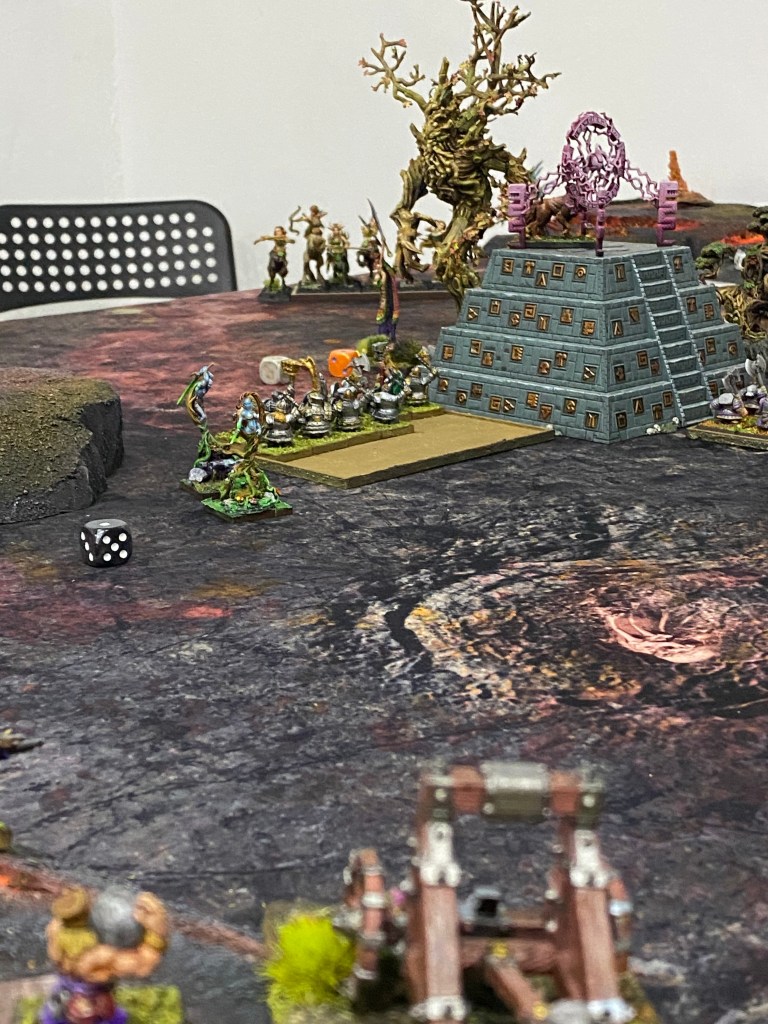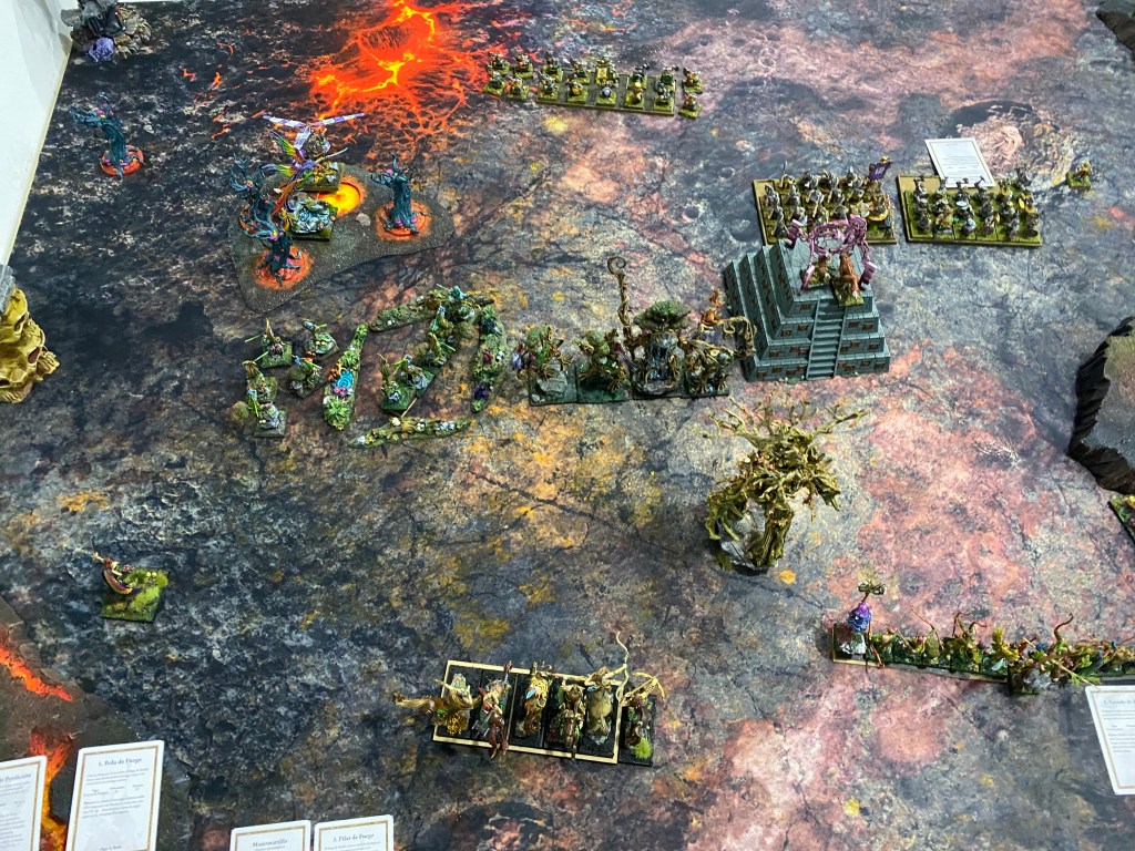 En la colina del flanco derecho, la artillería enana cantaba su canción de muerte. El Lanzaagravios disparó sin cesar. En uno de sus impactos de «punto de mira», una inmensa roca volcánica cayó a plomo sobre un Campeón Arbóreo. Sin embargo, la madera endurecida por milenios en Rocasangre demostró ser más resistente que la piedra; la roca se desintegró en una nube de polvo contra su corteza, dejándolo ileso.