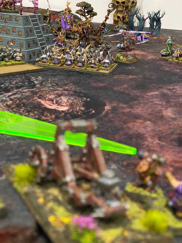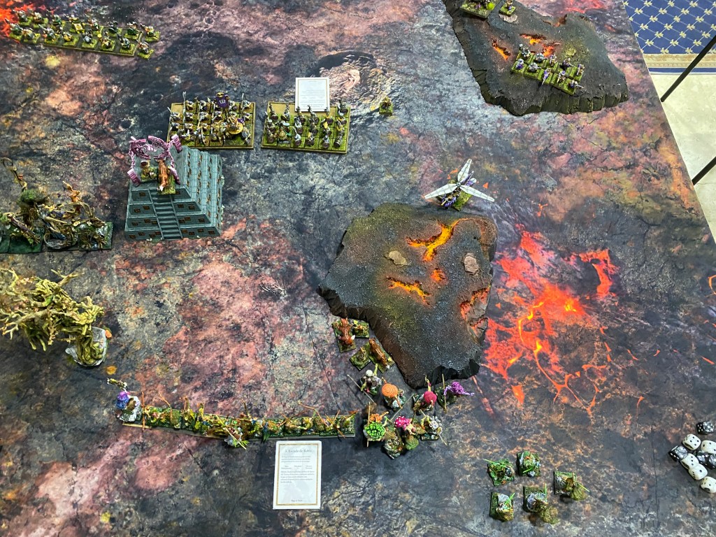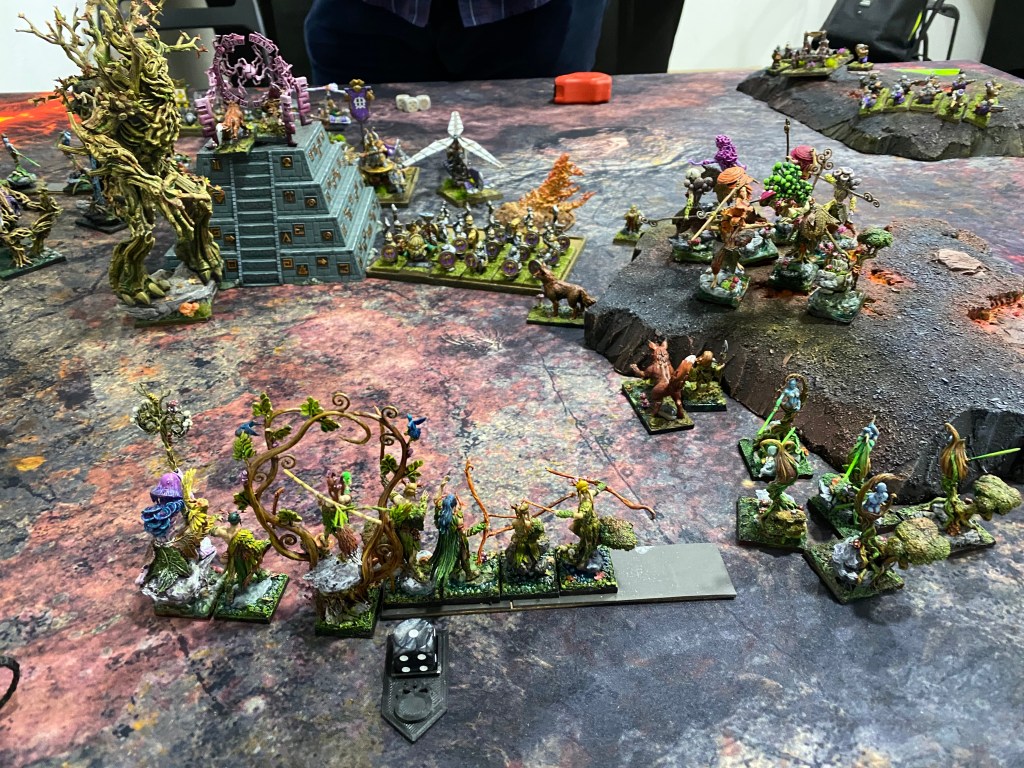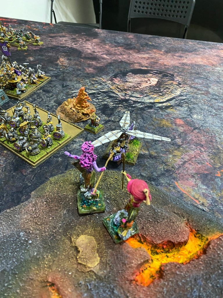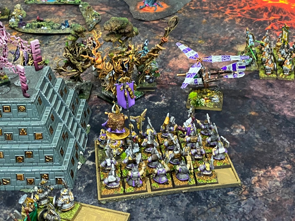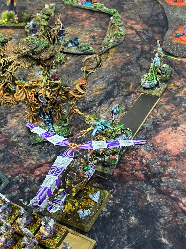 Por este flanco, otro girocóptero vaporizó a nuestros Saolines, pero finalmente, en una persecución implacable, las Dríades lograron cazarlo y destruirlo (la única unidad enana que cayó en toda la batalla).
