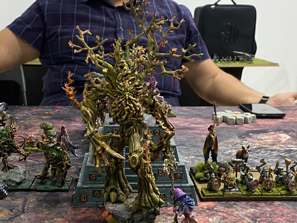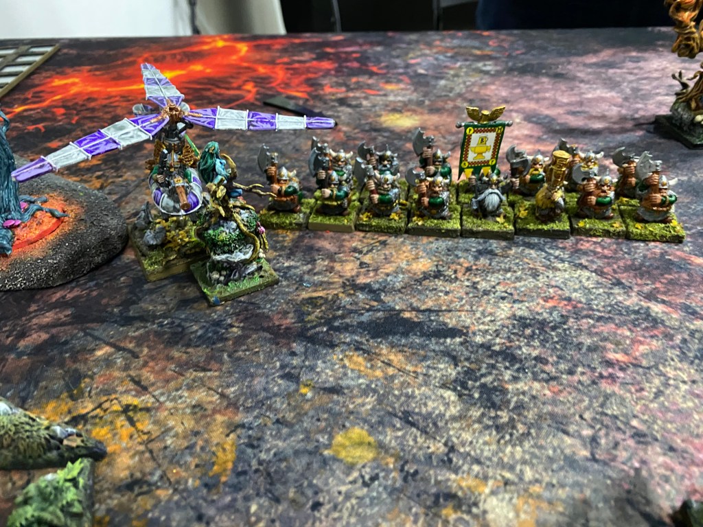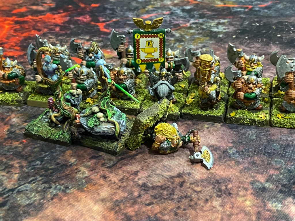 Nuestros guerreros esquivaron los golpes con gran agilidad, retrocediendo para ganar tiempo, hasta que la suerte se agotó. Un último Hijo del Bosque fue acorralado. Sabiendo que los enanos no debían pisar suelo sagrado (su objetivo secreto), entregó su vida estoicamente, utilizando su cuerpo destrozado para entorpecer el avance del bloque enano el tiempo suficiente.