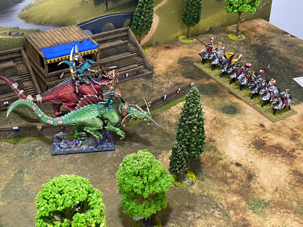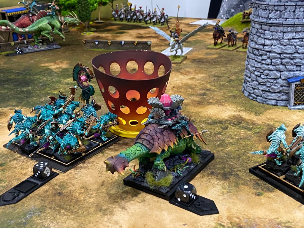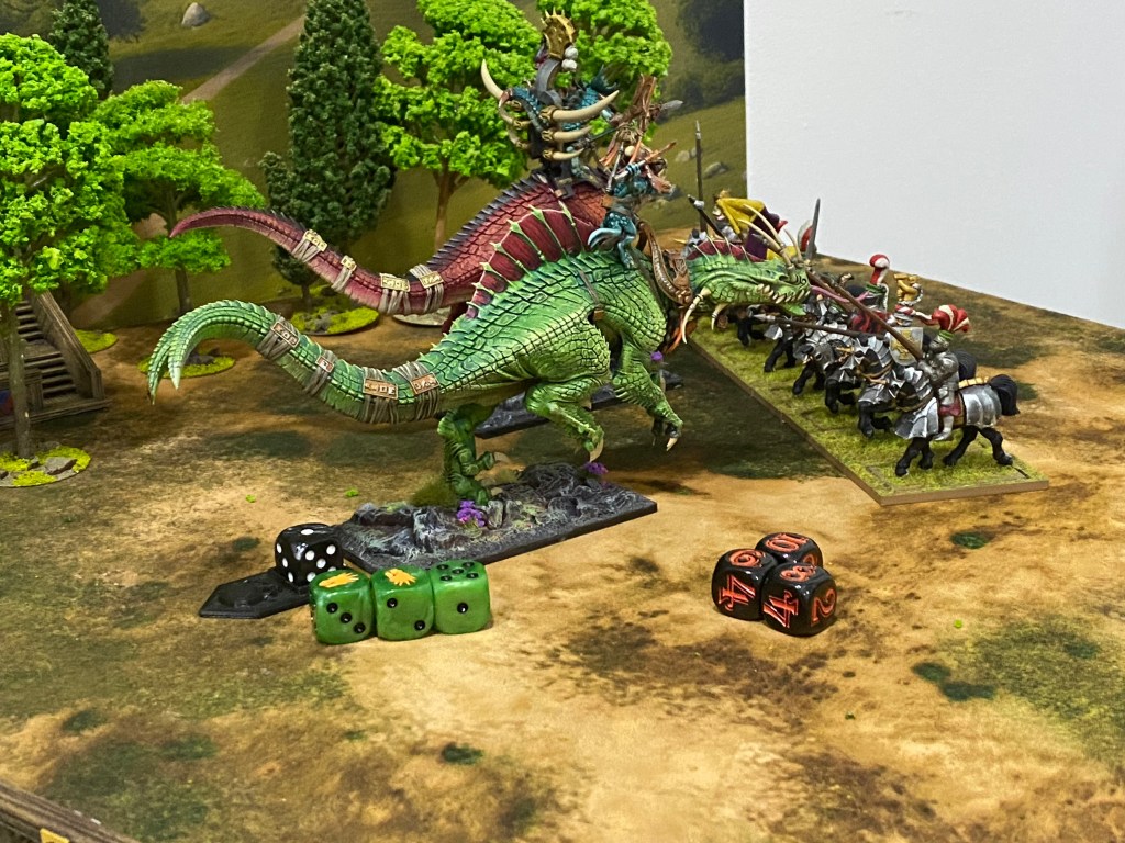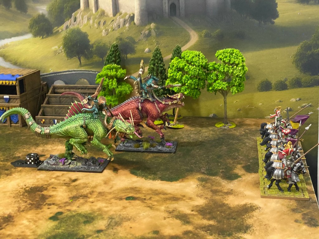 Allí donde la caballería imperial esperaba cargar con honor, se encontró con el terror absoluto. Kroq-Gar y su Portaestandarte invadieron el campo de justas. El suelo temblaba con cada zancada.