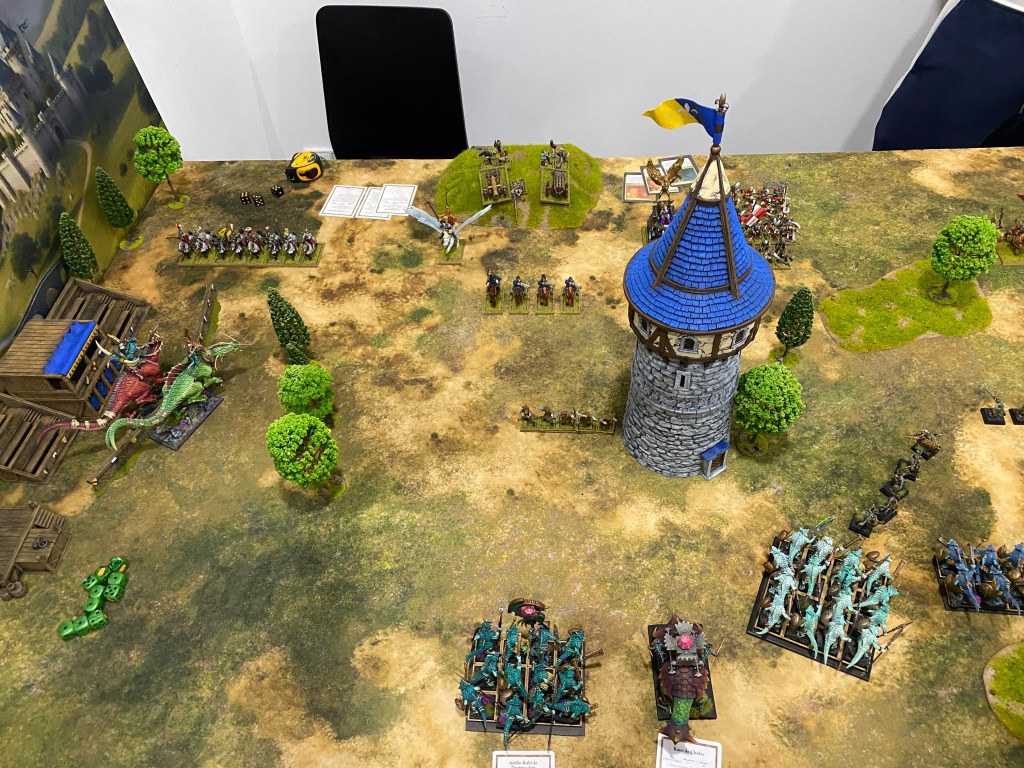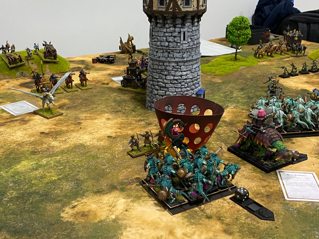 En el otro extremo del campo, los Kroxigors protagonizaron una maniobra magistral. Atravesando las filas de los eslizones con una coordinación perfecta, cargaron contra la caballería en Semigrifo. La fuerza bruta de los grandes lagartos logró abatir a una de las bestias imperiales, pero los Semigrifos, heridos en su orgullo, se antepusieron y acabaron venciendo el envite por pura tenacidad.