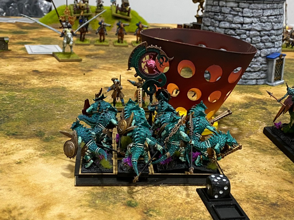 Sin embargo, el tiempo ganado fue vital. Los Eslizones Camaleón se convirtieron en los héroes anónimos de la jornada. Se sacrificaron con frialdad, ralentizando el avance de la infantería y el Carro de Guerra enemigo. Su entrega evitó que los Semigrifos y el pesado carro llegaran a la unidad principal de Guerreros Saurios, manteniendo el bloque central intacto.
