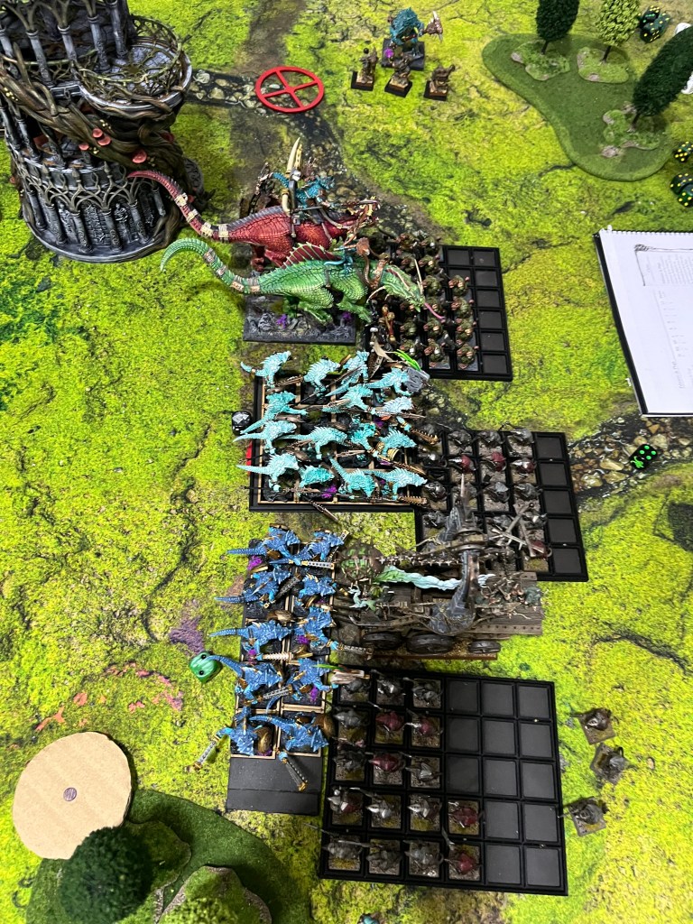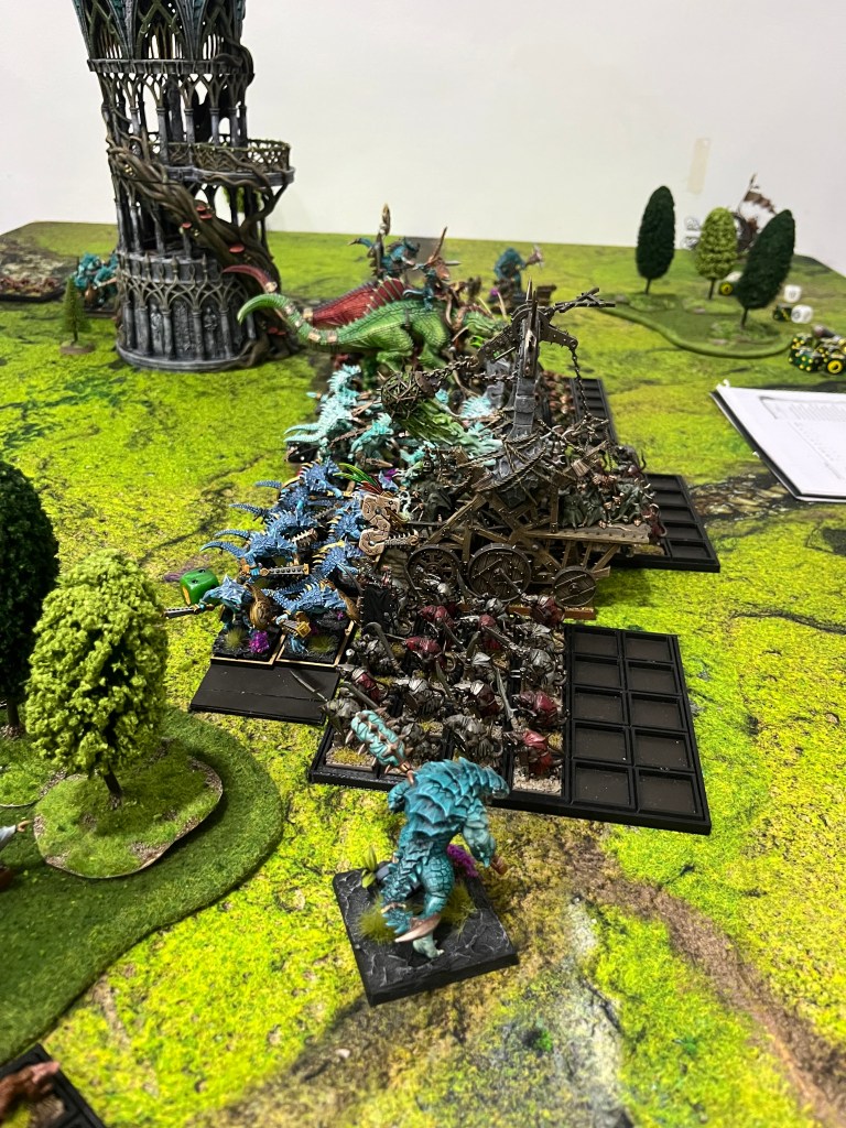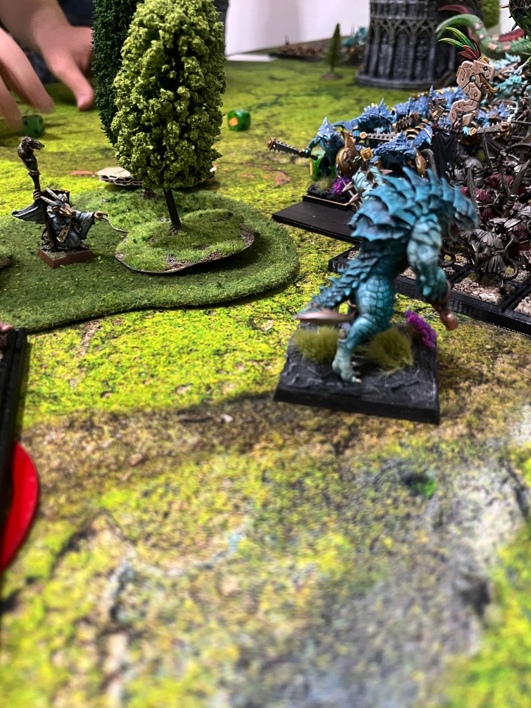 Mientras tanto, la infantería libraba su propia guerra de desgaste. Un asfixiante Pebetero de Plaga, escoltado por Guerreros del Clan, chocó contra una pequeña cohorte de diez Guerreros Saurios, aniquilándolos bajo una nube de gases tóxicos. Muy cerca, la línea principal se convertía en una picadora de carne, con una mermada unidad de dieciséis Guerreros Saurios enzarzada en un combate a muerte contra la otra gran masa de Guerreros del Clan.