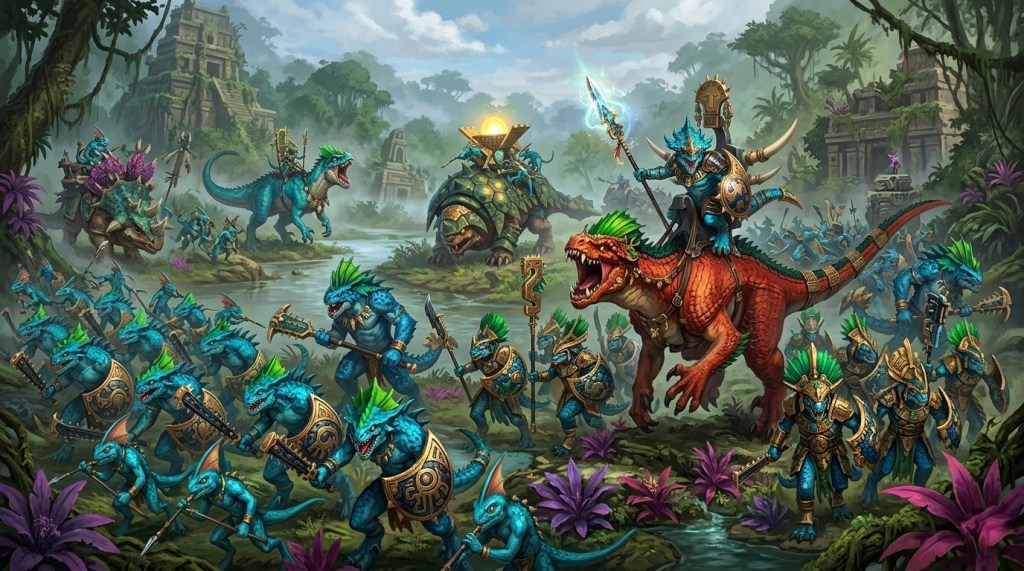 Tras él, la selva cobraba vida. El suelo temblaba bajo el paso rítmico y disciplinado de los pesados bloques de Guerreros Saurio, una muralla inquebrantable de escamas azuladas y escudos de obsidiana. Entre sus filas, la Guardia del Templo custodiaba los artefactos sagrados, liderados por un campeón cuyo anillo mágico ardía con la promesa del fuego purificador.